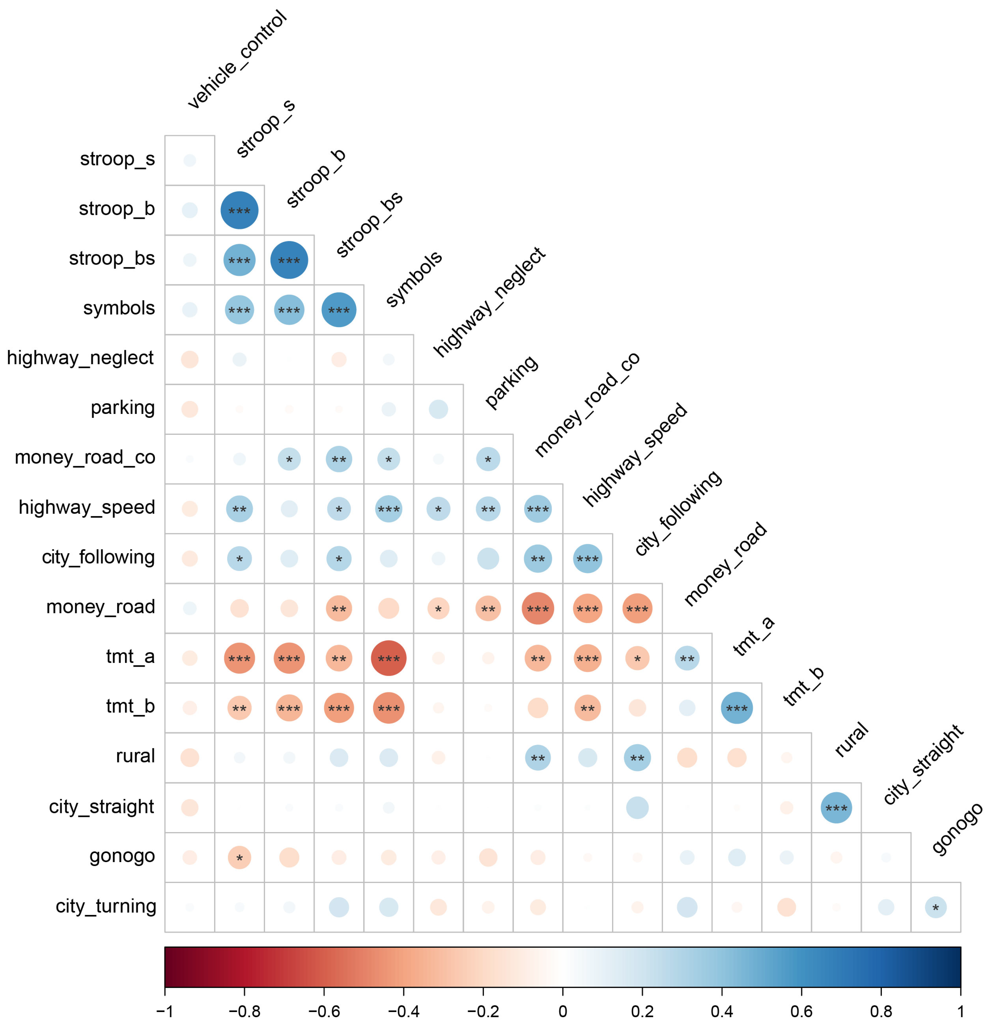 Figure 4. In general, better scores on measures of attention, processing speed, and executive control were moderately associated with better performance in more demanding driving tasks, whereas slower or less efficient cognitive performance tended to co-occur with less stable vehicle control and less adaptive driving behavior.