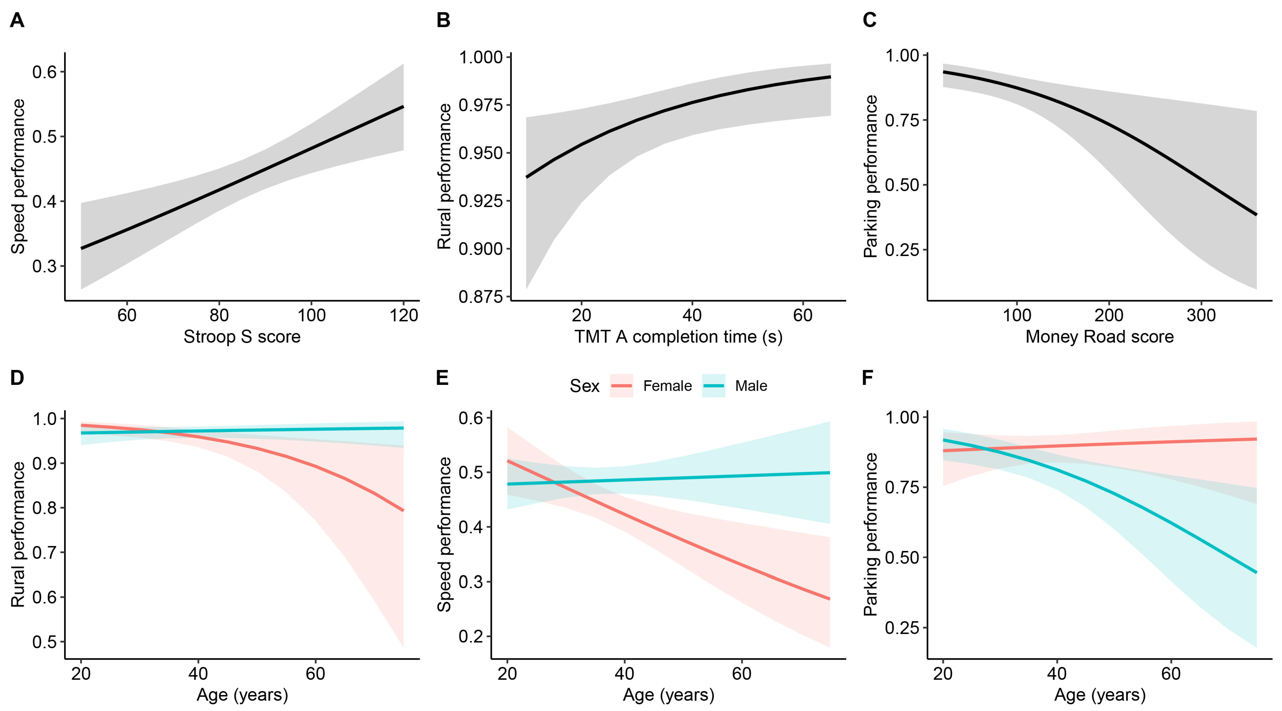 To further assess predictive value, we fit separate beta regression models for each simulator task score using cognitive test performance plus demographic covariates (age, sex, and their interaction) as predictors. Representative partial effects are visualized in