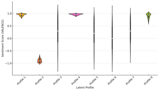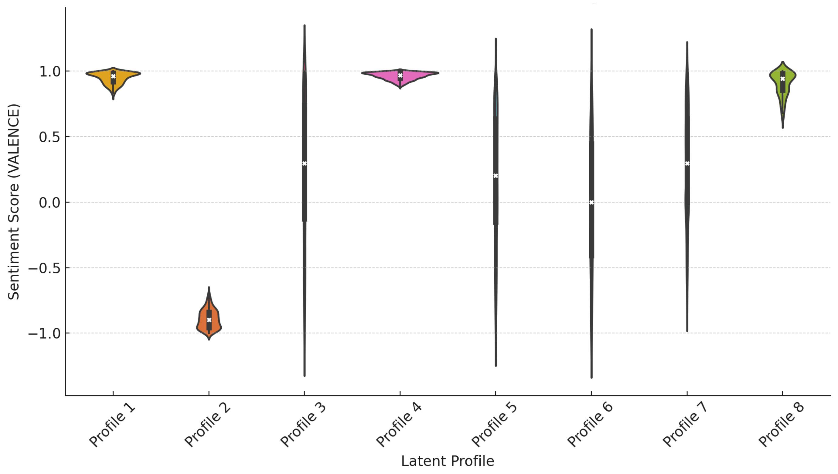 Figure 2 illustrates the emotional structure of each profile using a violin plot, highlighting differences in both central tendency and variance. For example, Profile 1 exhibits a consistently high positive sentiment, whereas Profile 2 is characterized by strongly negative scores. These distributional patterns are consistent with the regression results and further support the presence of distinct emotional dynamics within each latent profile.