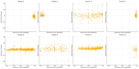 Profile 1 is characterized by a predominantly positive sentiment (‘VALENCE’ variable), with articles reflecting generally optimistic tones. The corresponding stock price changes (‘Change’ variable) show a clear positive trend, indicating a strong association between positive sentiment and stock price increases. Profile 1 yielded a high positive coefficient in the regression analysis, underscoring its importance as a key driver in sentiment-based stock price forecasting.