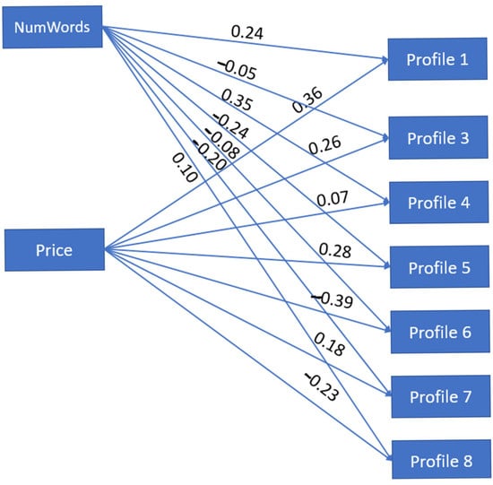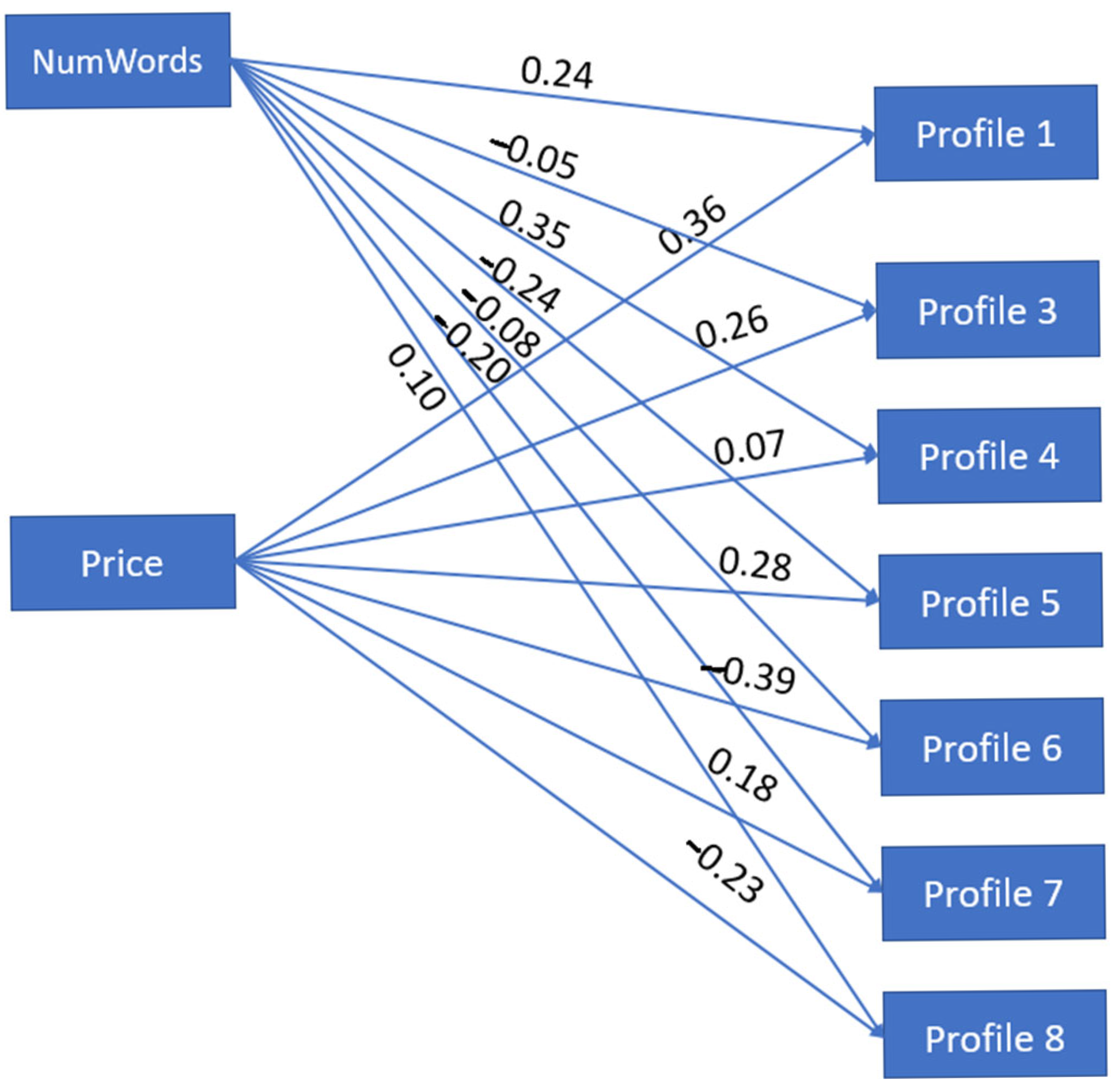 The analysis began with a simple linear regression model, in which price was the dependent variable and valence served as the independent variable. Next, eight separate regressions were conducted, each using one of the latent profiles as a single independent variable, again predicting price.