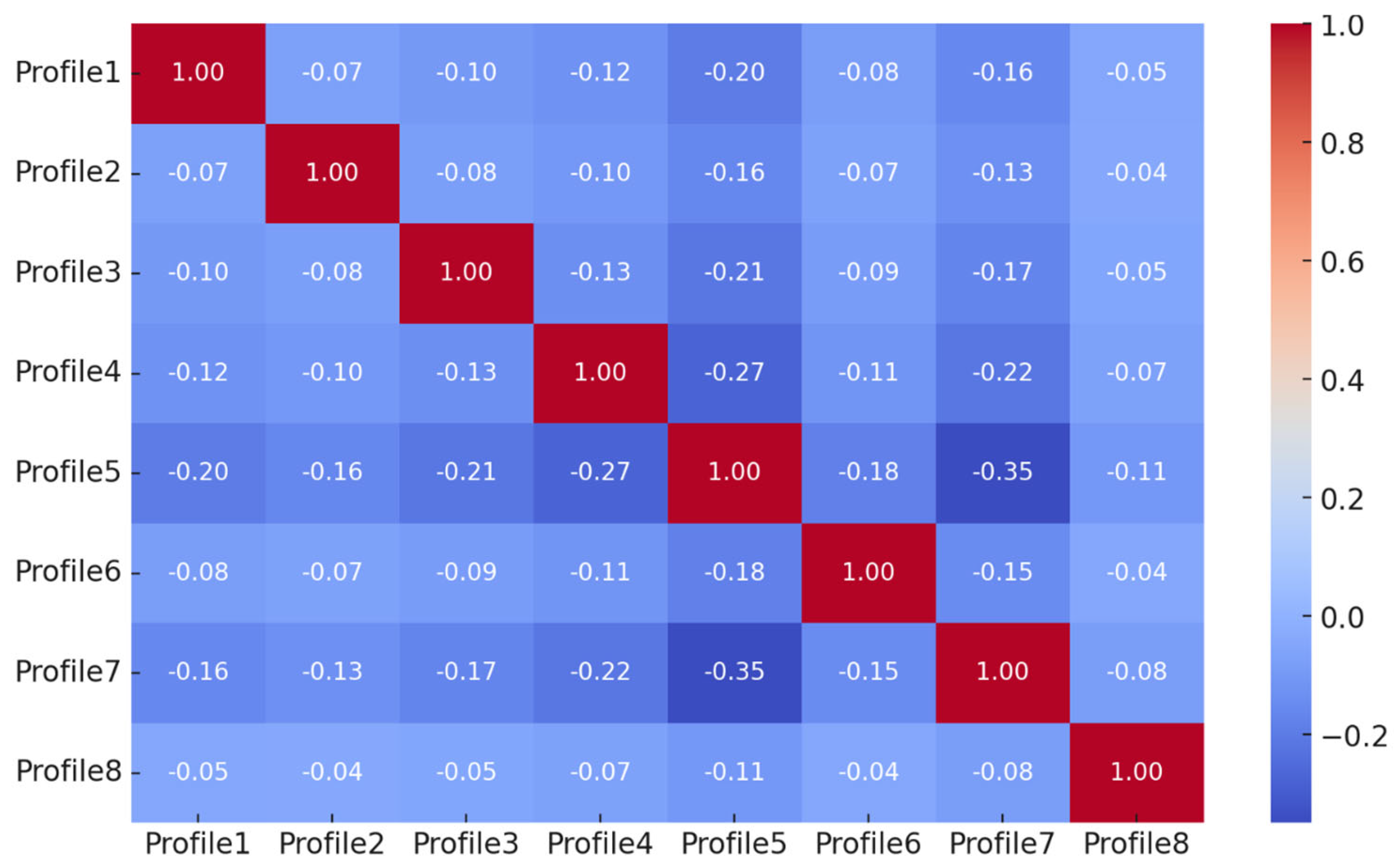 Figure 1 presents the correlation heatmap of the latent profiles. As shown, no strong correlations (i.e., above 0.7) were observed between the profiles. This suggests that the profiles are relatively independent from one another in terms of linear associations and do not exhibit high similarity. These results support the conclusion that the latent profiles reflect distinct patterns within the dataset.