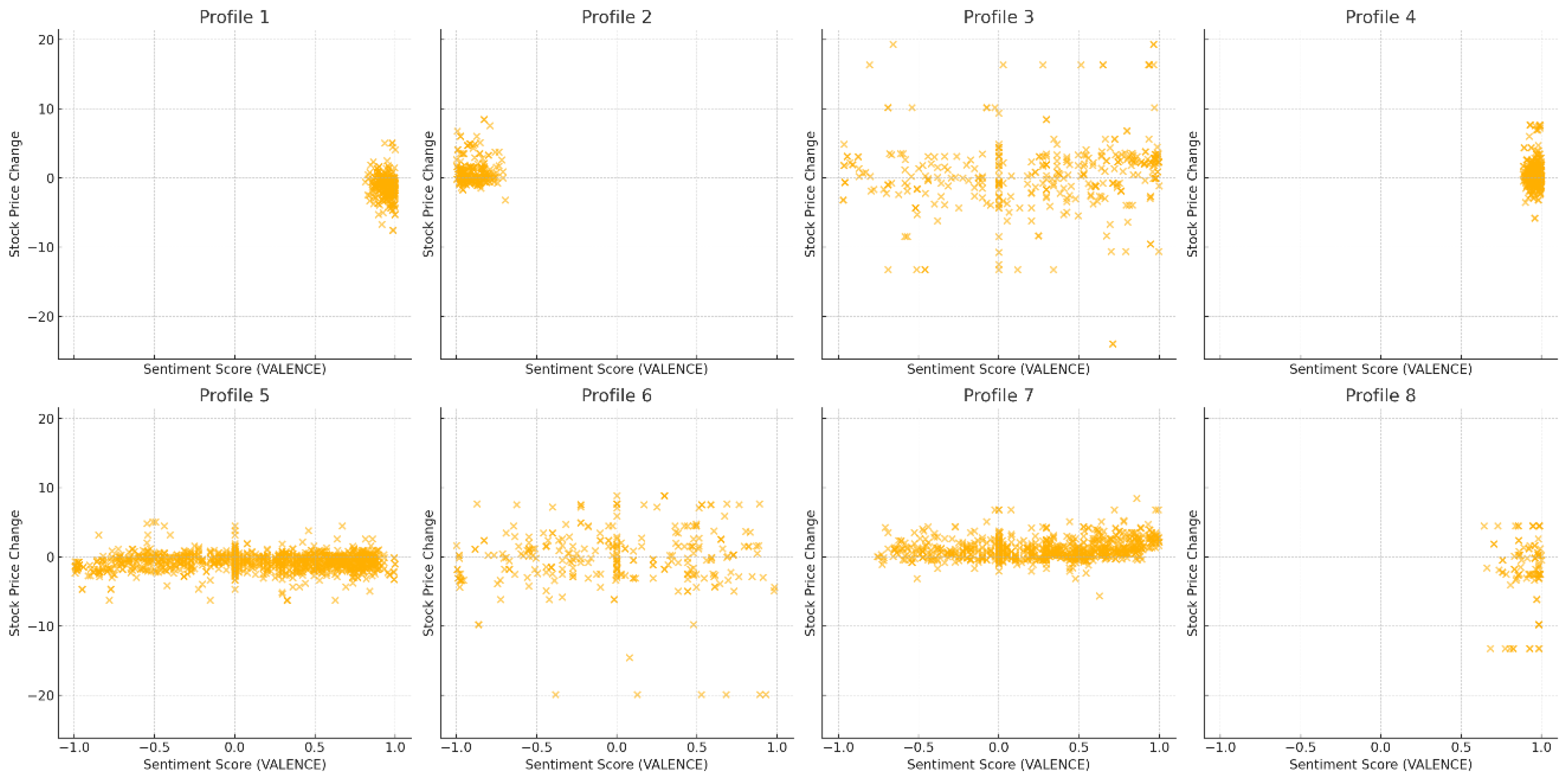 Profile 7 also displays largely neutral sentiment. Like Profile 4, stock price movements here are inconsistent and minimal. This profile demonstrates weak predictive value and contributes little to the regression model.