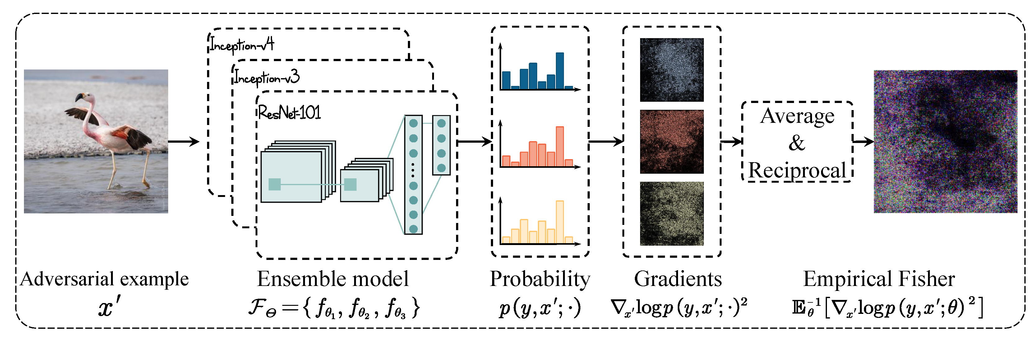 - An approximation of the Fisher information metric is proposed under the model ensemble setting, resulting in the same computational complexity of the proposd attack method as SAM and PGN, , where n represents the image size. This approximation achieves consistent performance as full Fisher matrix without incurring additional computational cost.