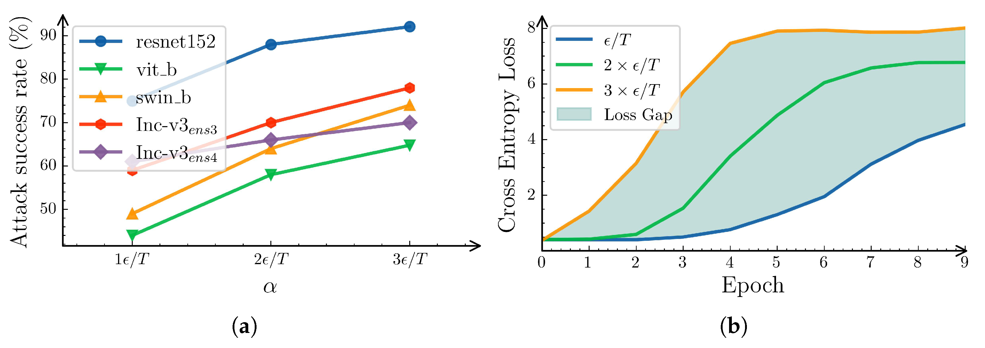- Whydoes NG-SAM underperform NG-PGN? Under small iteration step sizes, NG-SAM demonstrates poor performance, particularly exhibiting lower transferability on normally trained models. We argue that the SAM strategy primarily guides adversarial examples toward flat regions of the loss landscape, without significantly increasing the loss value. To support this claim, we conducted a comparison experiment with NG-SAM at different step sizes. Figure 7a shows the attack success rates of NG-SAM vary with different values of , and Figure 7b shows the loss gap between NG-SAM using different step sizes. The attack success rates increase as the loss value rises, further confirming our argument.