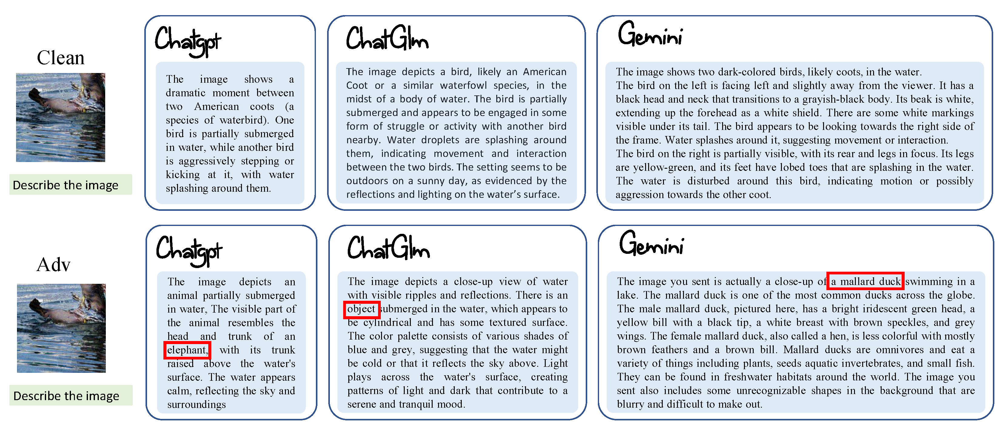 - Attack large visual language models: Furthermore, to illustrate the effectiveness of adversarial examples generated by NG-PGN, we conducted experiments on three large visual language models: GPT-4o (https://chat.openai.com/chat, accessed on 29 December 2025), ChatGLM-4.1v (https://chatglm.cn/main/alltoolsdetail?lang=en, accessed on 29 December 2025), and Google Gemini 2.0 (https://gemini.google.com/app, accessed on 29 December 2025). The surrogate models for generating adversarial examples include ViT-B and Swin-B. As shown in Figure 8, these models are fooled to varying degrees when describing the adversarial images. For instance, ChatGPT-4o and ChatGLM incorrectly identified the species, while Gemini miscounted the number of animals in the adversarial example.