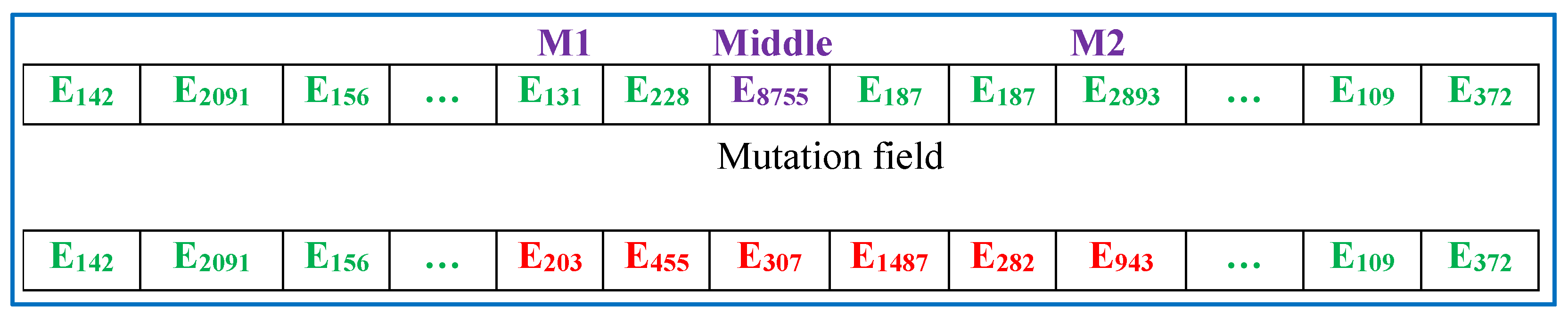 - Mutation operator: The mutation operator employs a common method, the simple mutation method. Specifically, elements randomly selected within sequence are replaced by an equal number of elements from the candidate set . In Figure 4, two random numbers and () are first generated as control parameters to set the mutation field. Then, the elements within the mutation field in sequence are replaced by new elements from the original system not chosen in the previous steps. Like the crossover operator, the mutation operator has a low incidence of validity of 3–5%. Moreover, the total number of mutation bits is finite, up to 50% of the entire length of the sequence .