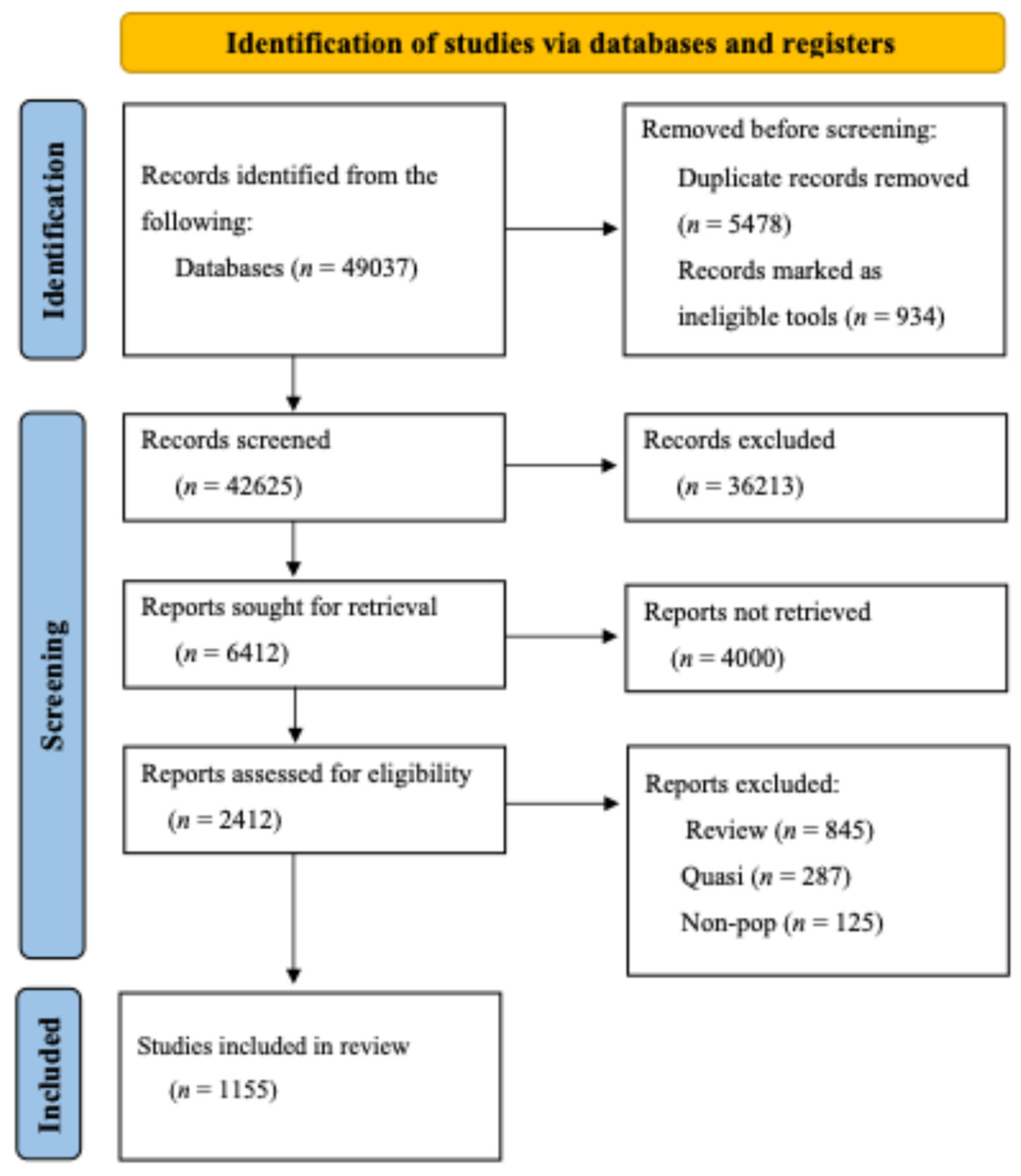 | Quality appraisal framework | MMAT 2018 | High (≥75%), moderate (50–74%), and low (<50%) | High = 557 (48.2%), moderate = 457 (39.6%), and low = 141 (12.2%) | = 0.86 |