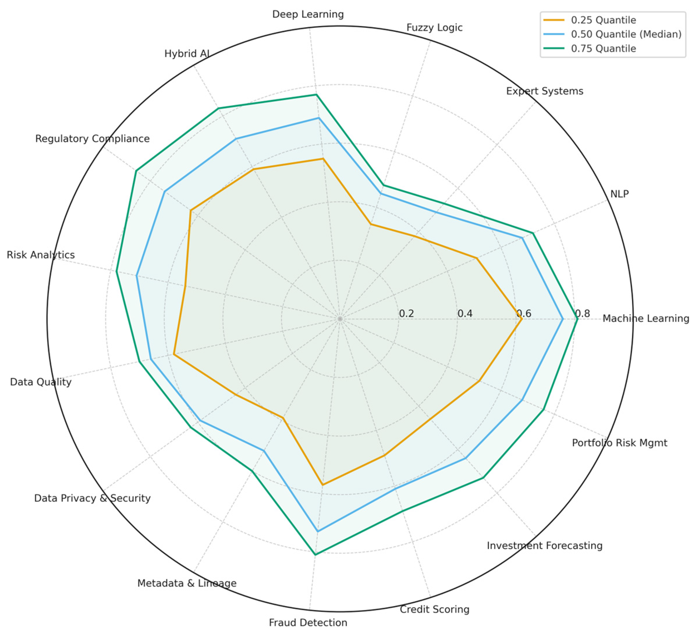 | Portfolio risk management | 0.52 | 0.68 | 0.76 | 0.24 | Cross-quantile strength was required to reflect institutional-grade modelling. | ≥ 0.75 at Q = 0.75. | A high-relevance outcome indicator was confirmed for risk-sensitive applications. |