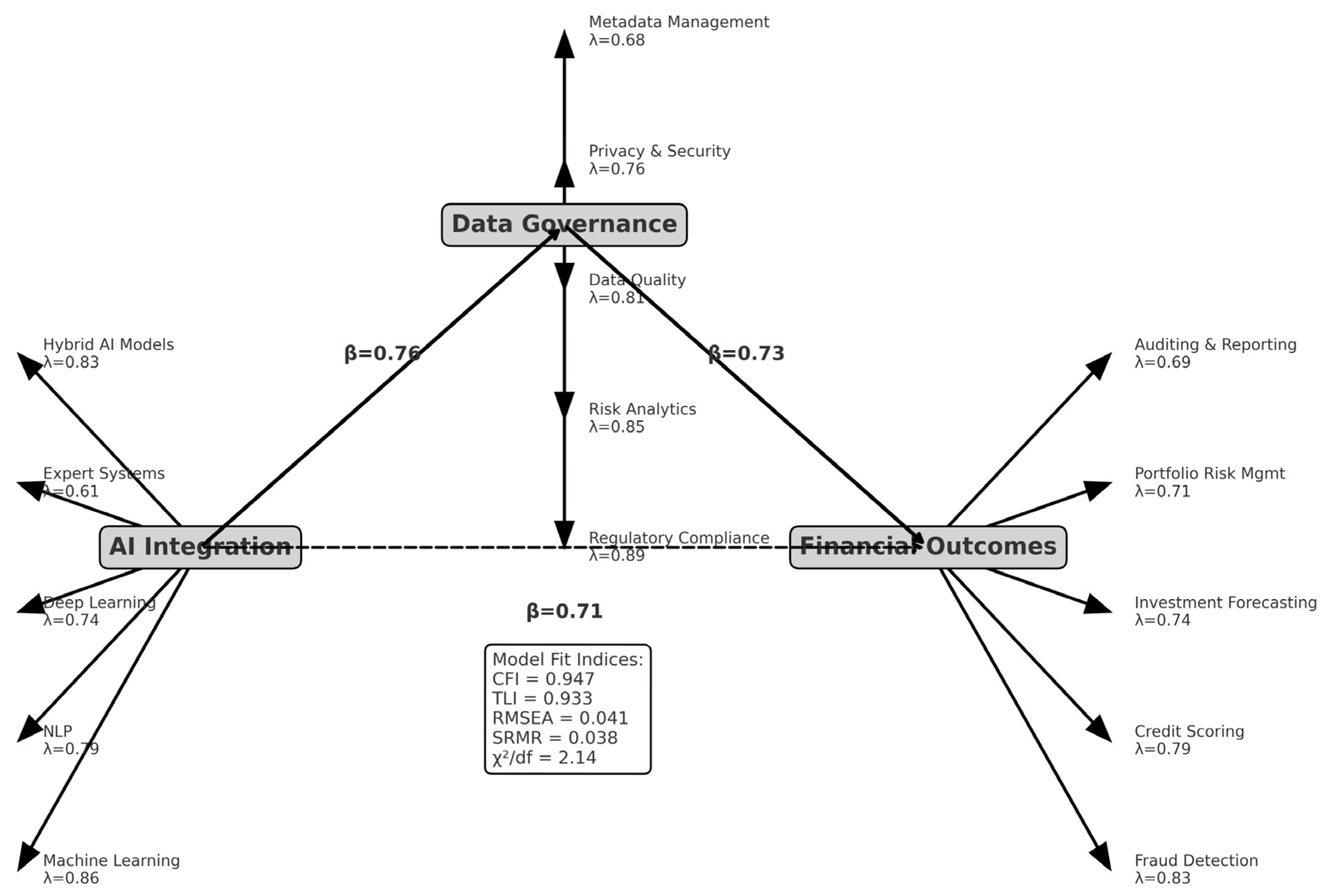 | Measurement model | AI integration | Expert systems | Legacy governance logic was represented to avoid excluding rule-based financial controls. | The item was required to reflect deterministic rule engines used in constrained decision settings. | Loading was required to be acceptable and significant (λ ≥ 0.60; p < 0.001). | It was retained as a supplementary indicator. |
