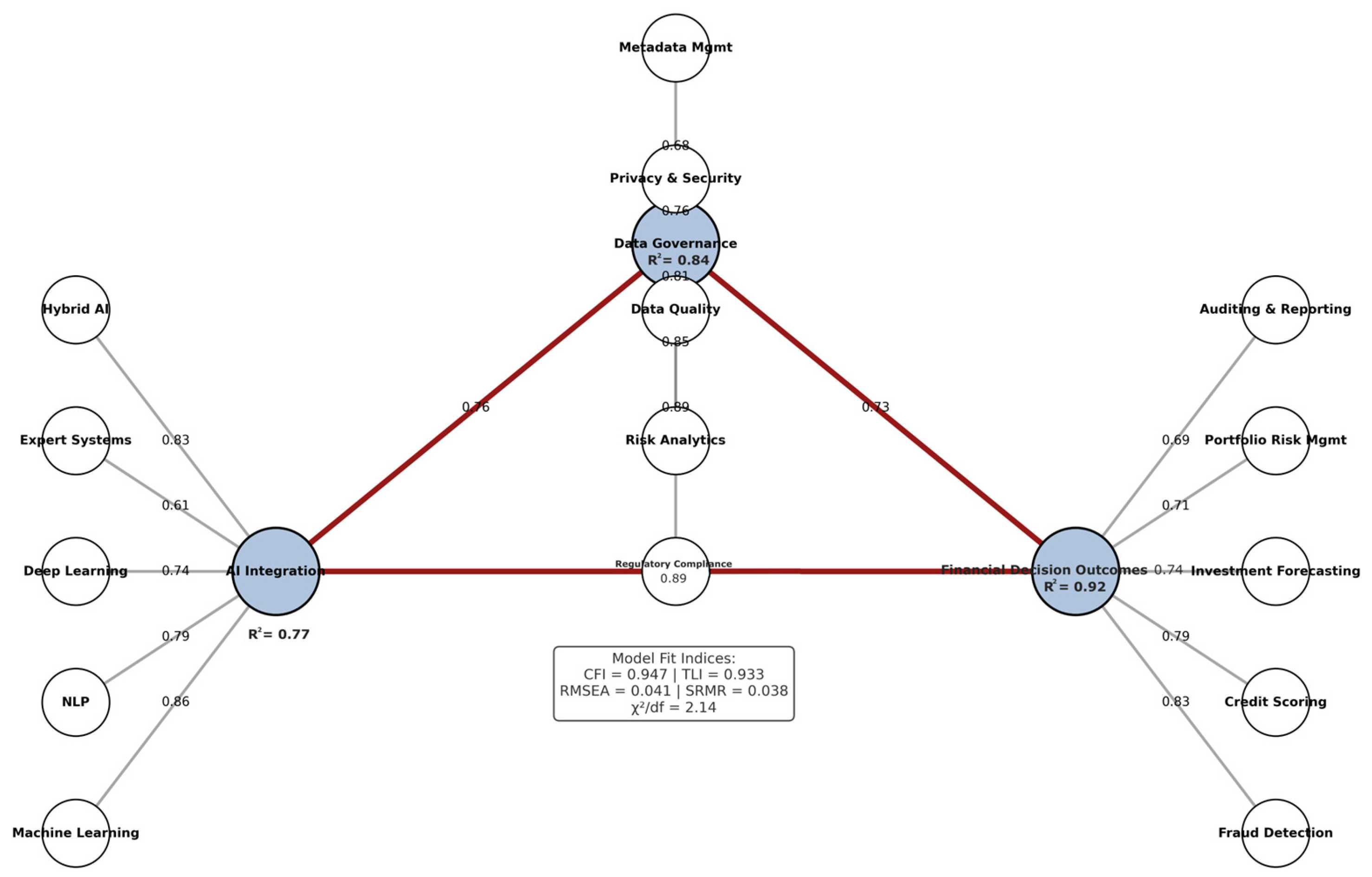 | Financial decision outcomes | 0.87 | 0.61 | 0.51 | 0.45 | 0.781 | 0.714 (with data governance) | Established (0.781 > 0.714) |