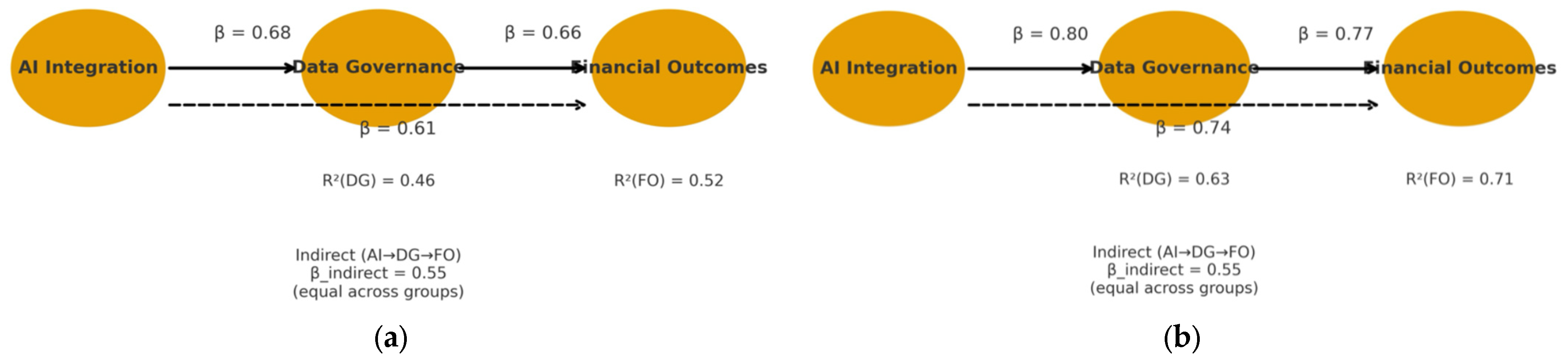 | Direct path: Data governance → Financial outcomes | (free across groups) | = 0.66 | = 0.77 | = +0.11 |