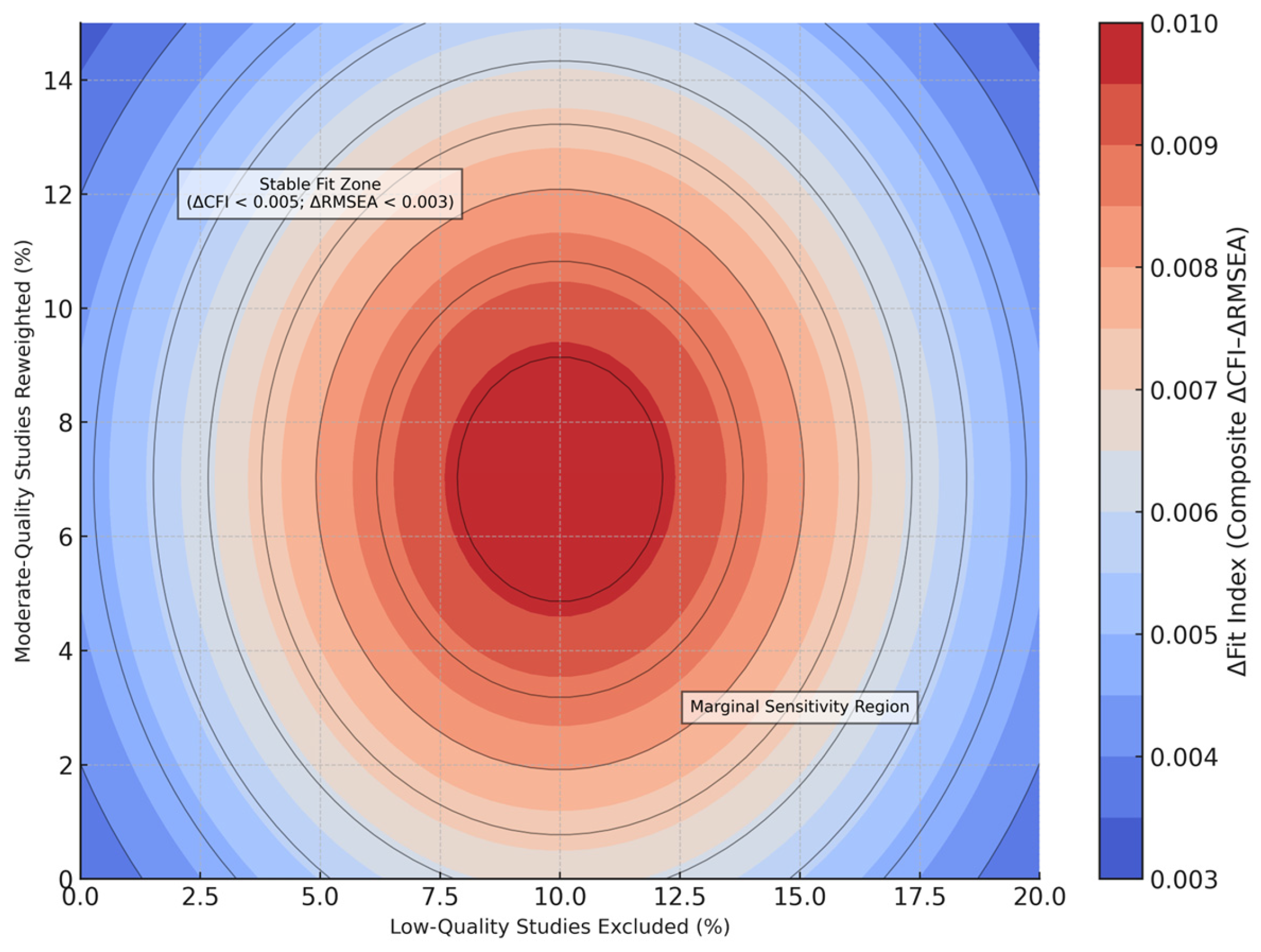 | Sensitivity test 1: Study quality exclusion | Re-estimate SEM excluding low-quality studies | ΔCFI = +0.004, ΔRMSEA = −0.002 | p < 0.001 | ± 0.01 |