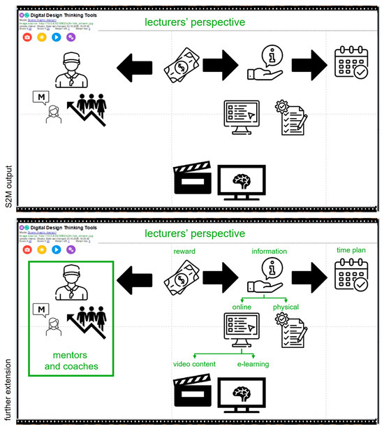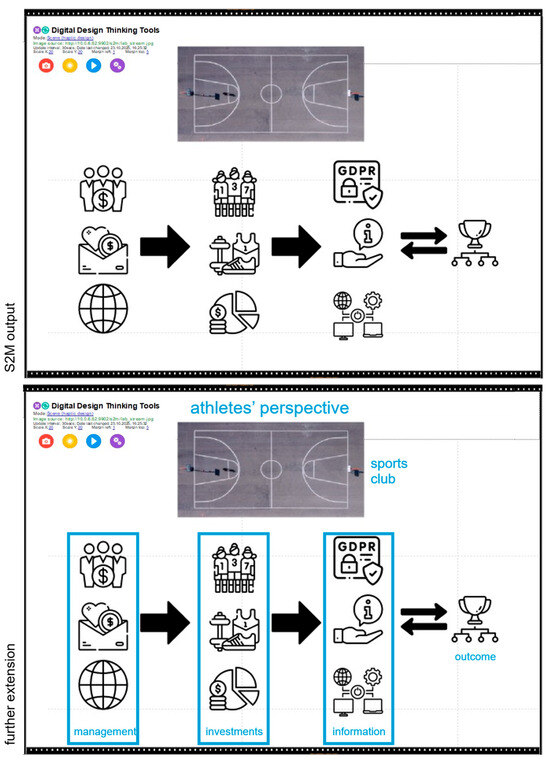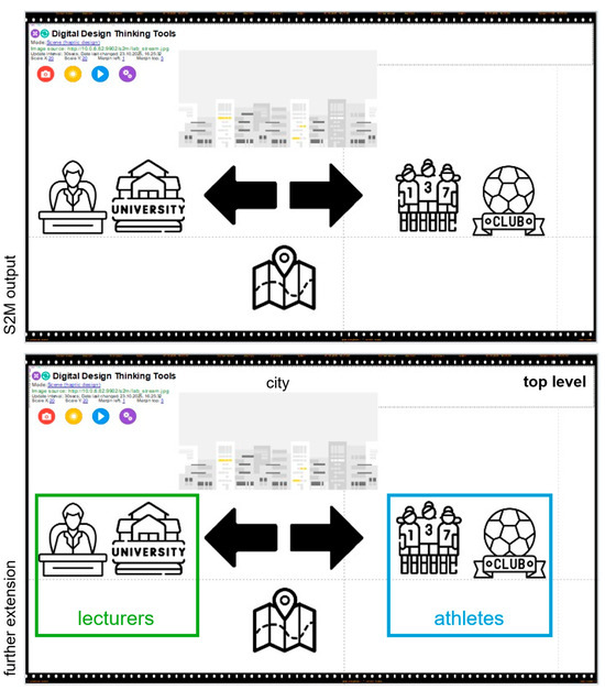 The study uses a combination of approaches. The methods we used included analysis, synthesis, induction, deduction, comparison of examples from practice, content analysis of documents, creation of our own case study, and modelling using Scene2Model technology. This enables the creation of conceptual models [50]. In our study, the conceptual model created is a digital twin version of the proposed athletes’ education process. A design thinking workshop was included in the design of the digital twin model to ensure that the opinions of the connected stakeholders could be considered in the result. The stakeholders were represented by active young athletes, a sports organization’s management, and potential lecturers. The entire design thinking workshop was conducted according to the structure used within the “New generations of founders” organization from the Grow with Google programme [51]. The workshop participants were assigned the following roles: interviewers, observers, timekeepers, solution users, and presenters. The solution’s users were the stakeholders described above. These members also answered questions formed by the group (the complete list is attached in Appendix A). The questions were generated directly at the workshop after the presentation of the problem being solved. During the dialogues between the interviewers and the solution’s users, the observers filled the empathy maps with the following structure: what the interviewees say, what they do, what they think, and how they feel. The collected information was later applied directly by the workshop participants within the creation of a solution’s prototype in the form of a digital twin model.