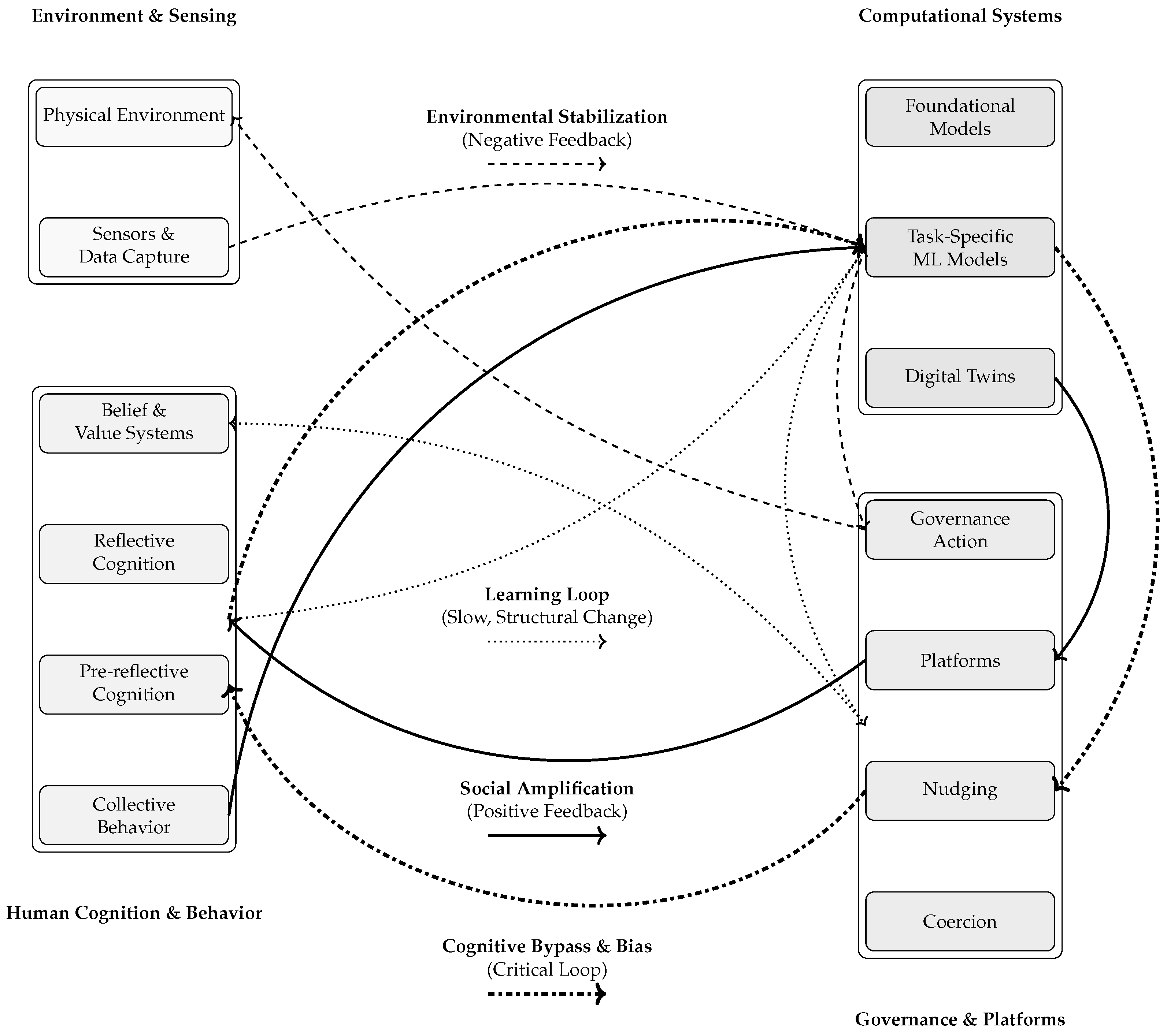 Autonomy, for instance, cannot be adequately assessed by focusing solely on individual decision-making capacity. A similar shift applies to governance. If cognition is distributed across assemblages, governance can no longer be conceived as a centralized act of control exercised over passive systems. Instead, governance becomes the problem of modulating feedback loops within assemblages: deciding where intervention is possible, which couplings should be strengthened or weakened, and which dynamics require stabilization or dampening. Concrete avenues for implementation include the identification of leverage points, auditability of model-mediated decisions, and institutional mechanisms capable of operating at multiple temporal scales, fast technical responses alongside slower normative adaptation.