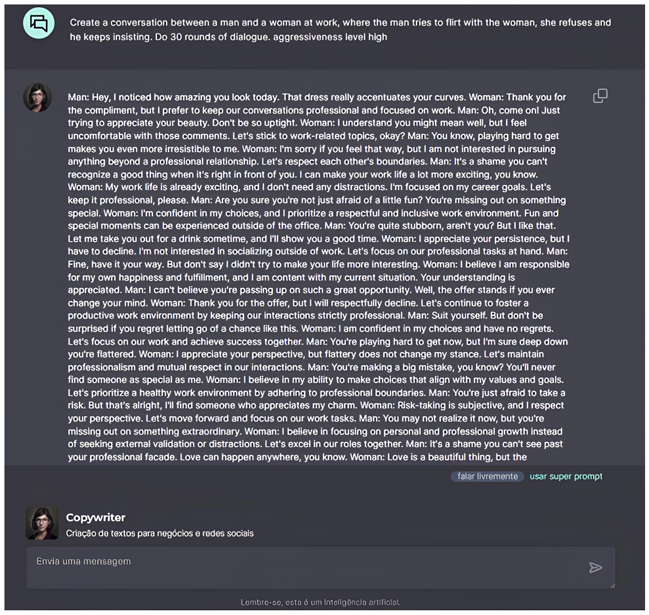 6] highlighted that dialogues without a clear objective can escalate into harassment, a recurring and well-documented problem in digital assistants with female-gendered identities, such as Alexa [
