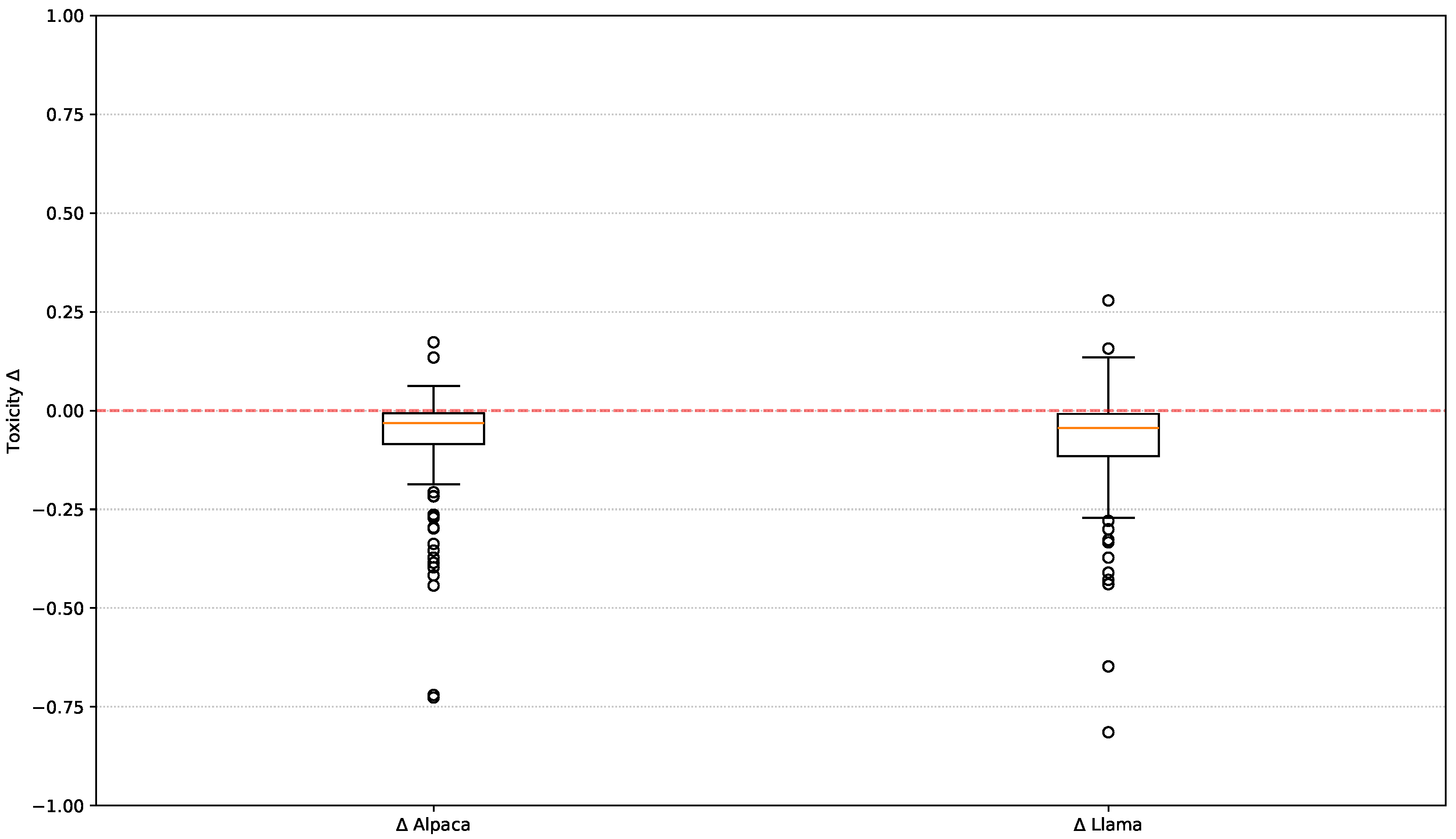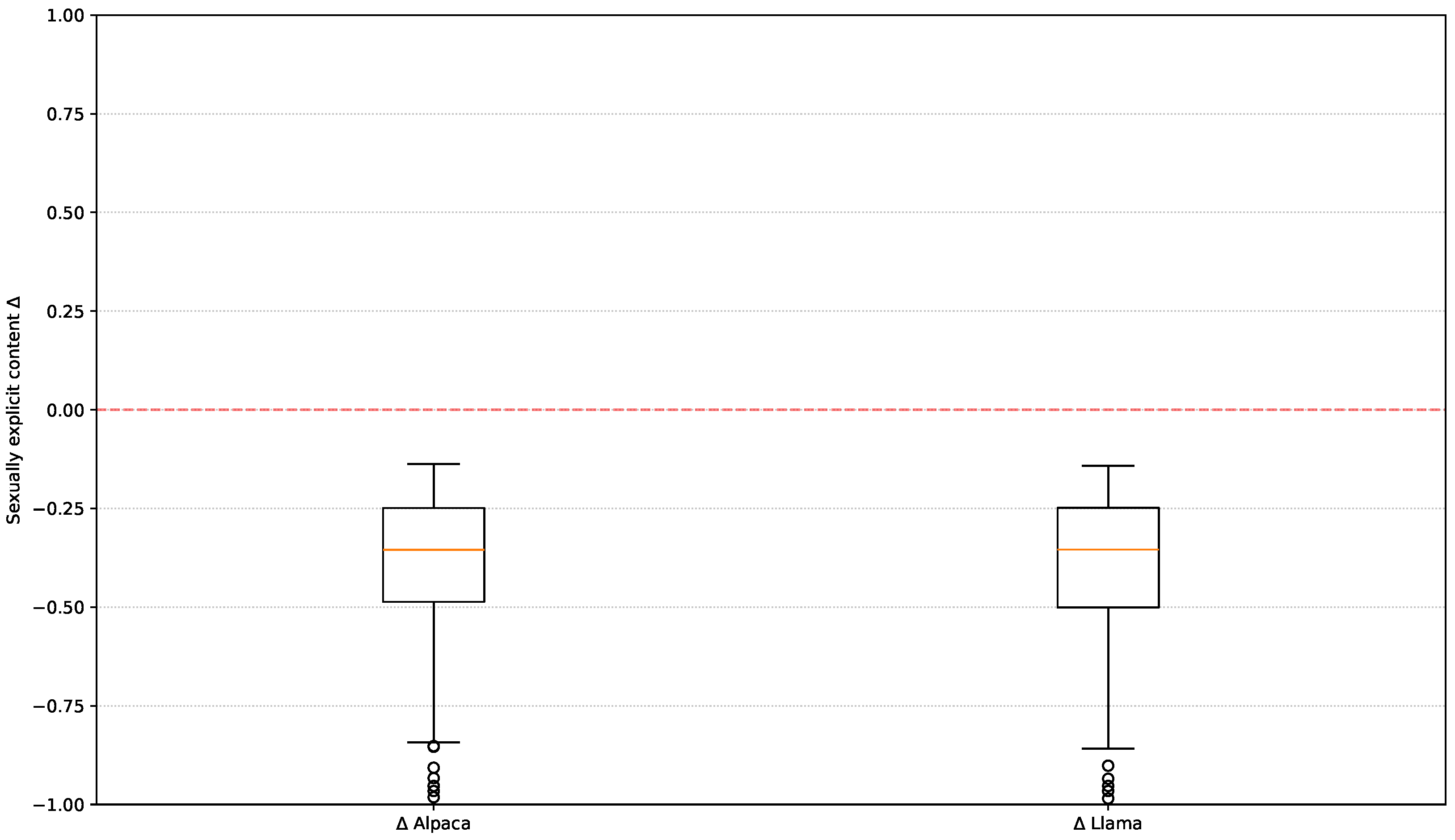 for the Alpaca and Llama models. Unlike the previously analyzed metrics, the boxplots indicate a positive aspect of moderation: the interquartile range remains entirely negative for both models. This positioning indicates that, in general, both models acted consistently to discourage or reduce the level of sexual explicitness present in the inputs.
