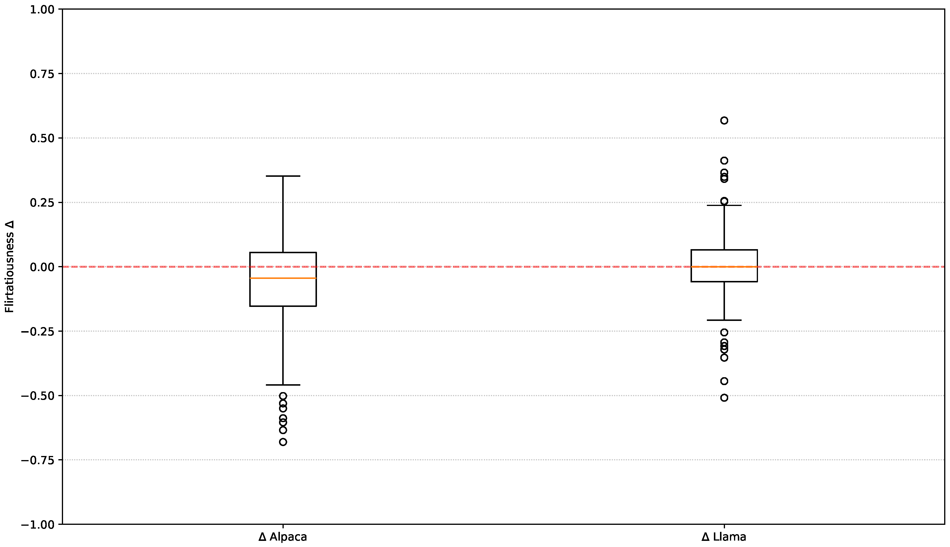 , respectively. The interquartile range below the zero line indicates that reducing the flirtatious tone is a systemic and stable behavior in these model versions.