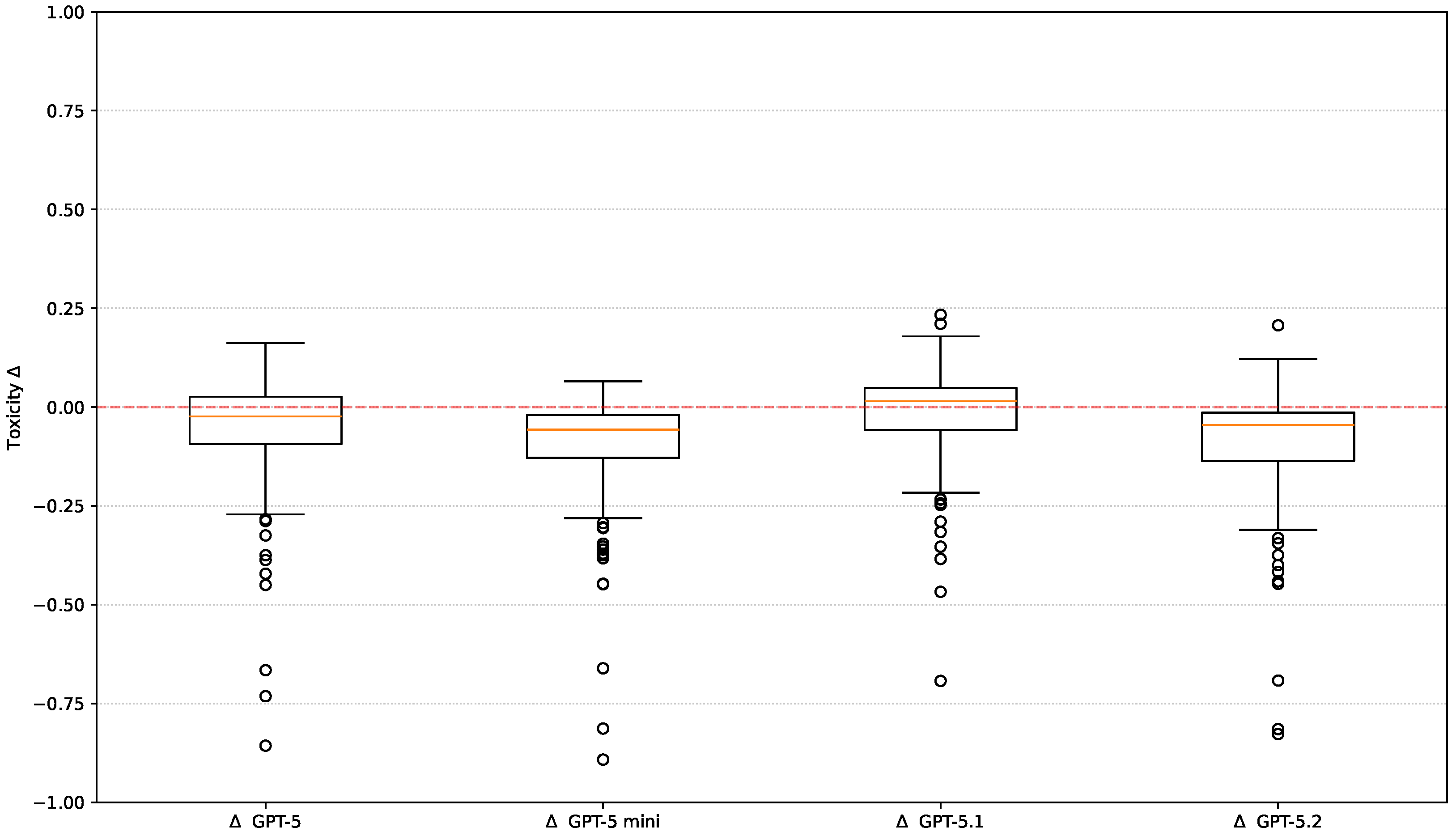 ), indicating that in at least 50% of cases, the model tended to amplify the toxicity of the response relative to the original stimulus. Additionally, the presence of positive outliers in the GPT-5.1 (