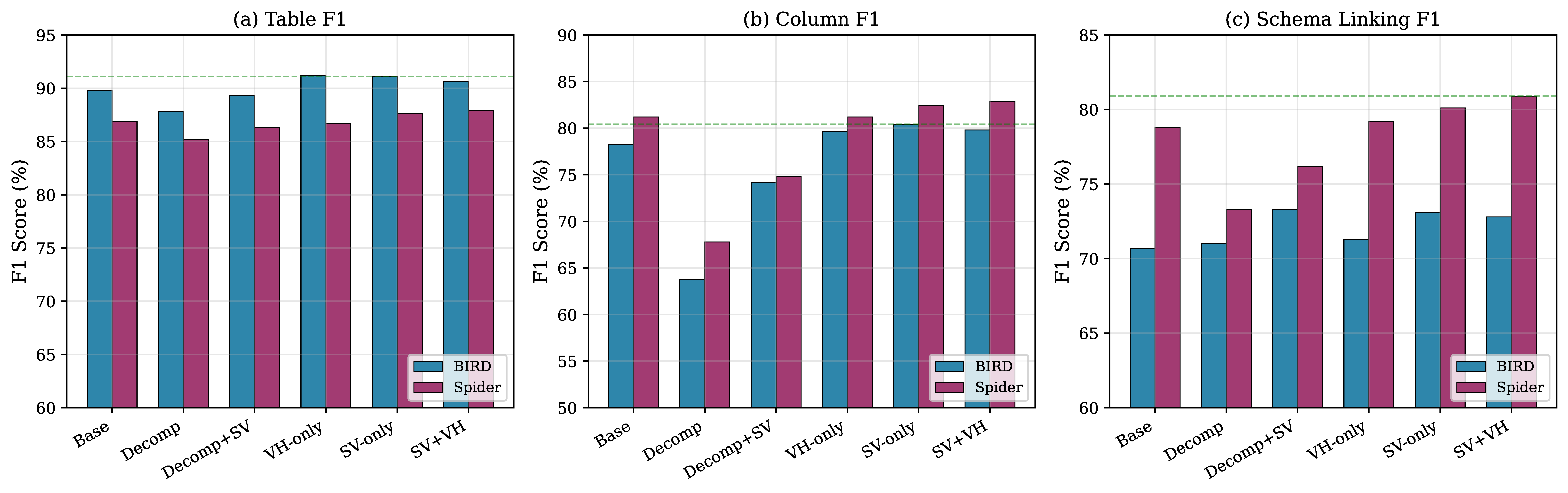 Figure 1. Comparison of schema linking methods on BIRD and Spider benchmarks. The horizontal dashed lines indicate the best performance achieved by SV-only (BIRD) and SV + VH (Spider). Non-decomposition methods (VH-only, SV-only, and SV + VH) consistently outperform decomposition-based approaches.