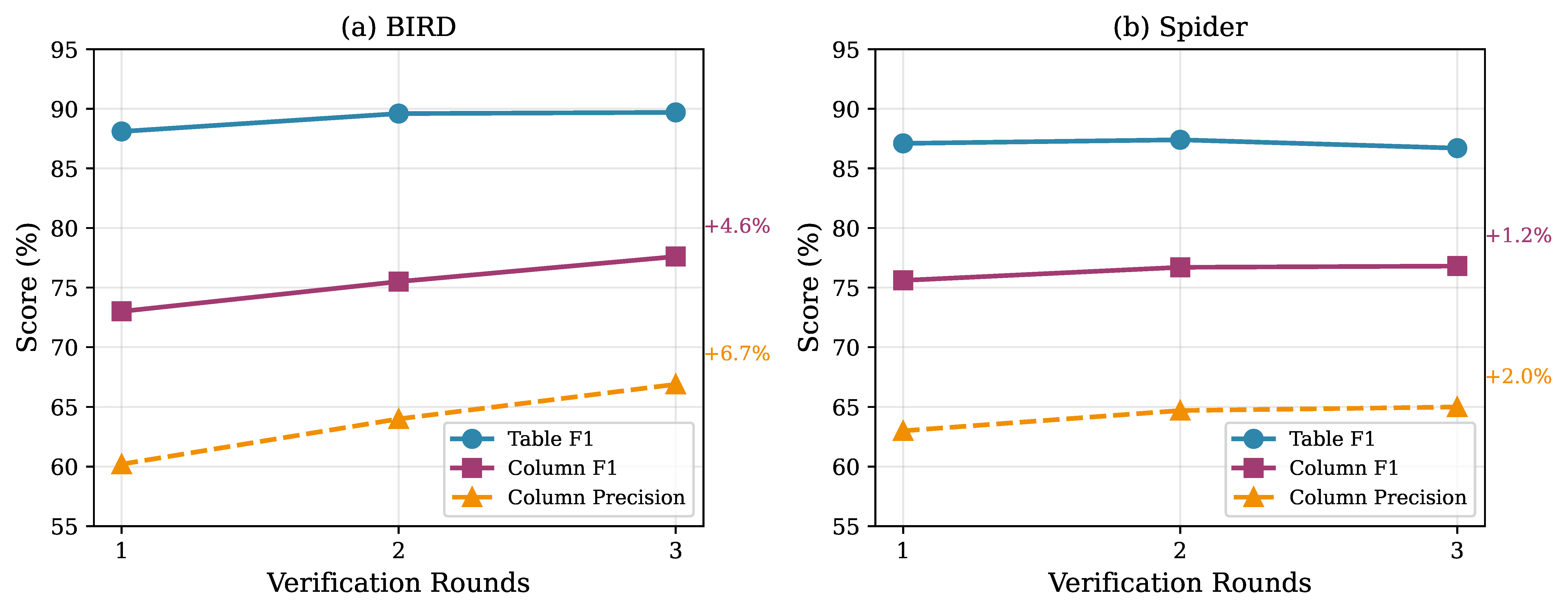 Figure 2. Effect of verification rounds on schema linking performance. Column F1 and column precision show consistent improvement with additional verification rounds on BIRD, with +4.6% F1 and +6.7% precision gain from 1 to 3 rounds. Spider shows smaller but consistent gains.