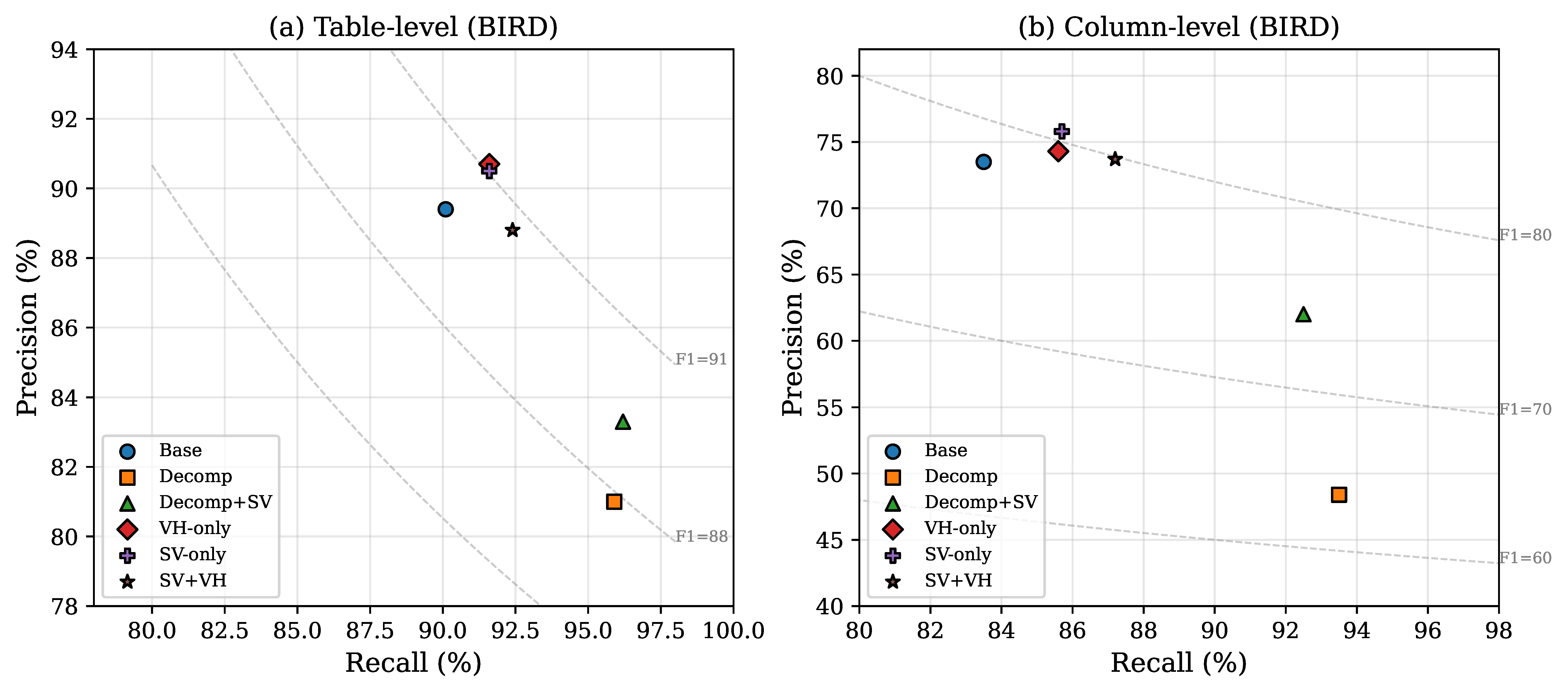 Figure 3. Precision–recall scatter plots on BIRD dataset. (a) Table level: All methods achieve high recall, but Decomp sacrifices precision. (b) Column level: Decomp achieves very high recall (93.5%) but suffers from extremely low precision (48.4%). SV-only achieves the best balance with high precision and recall. Dashed lines represent iso-F1 contours.