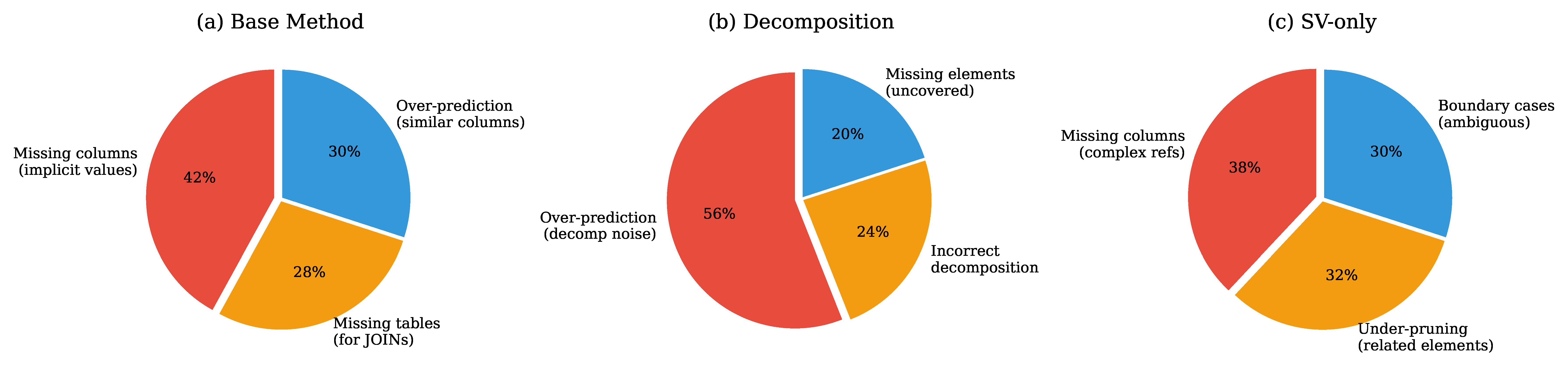Figure 4. Error distribution analysis for different methods. (a) Base method: Rrrors primarily from missing columns for implicit values. (b) Decomposition: Dominated by over-prediction from decomposition noise (56%). (c) SV-only: More balanced error distribution with reduced over-prediction.