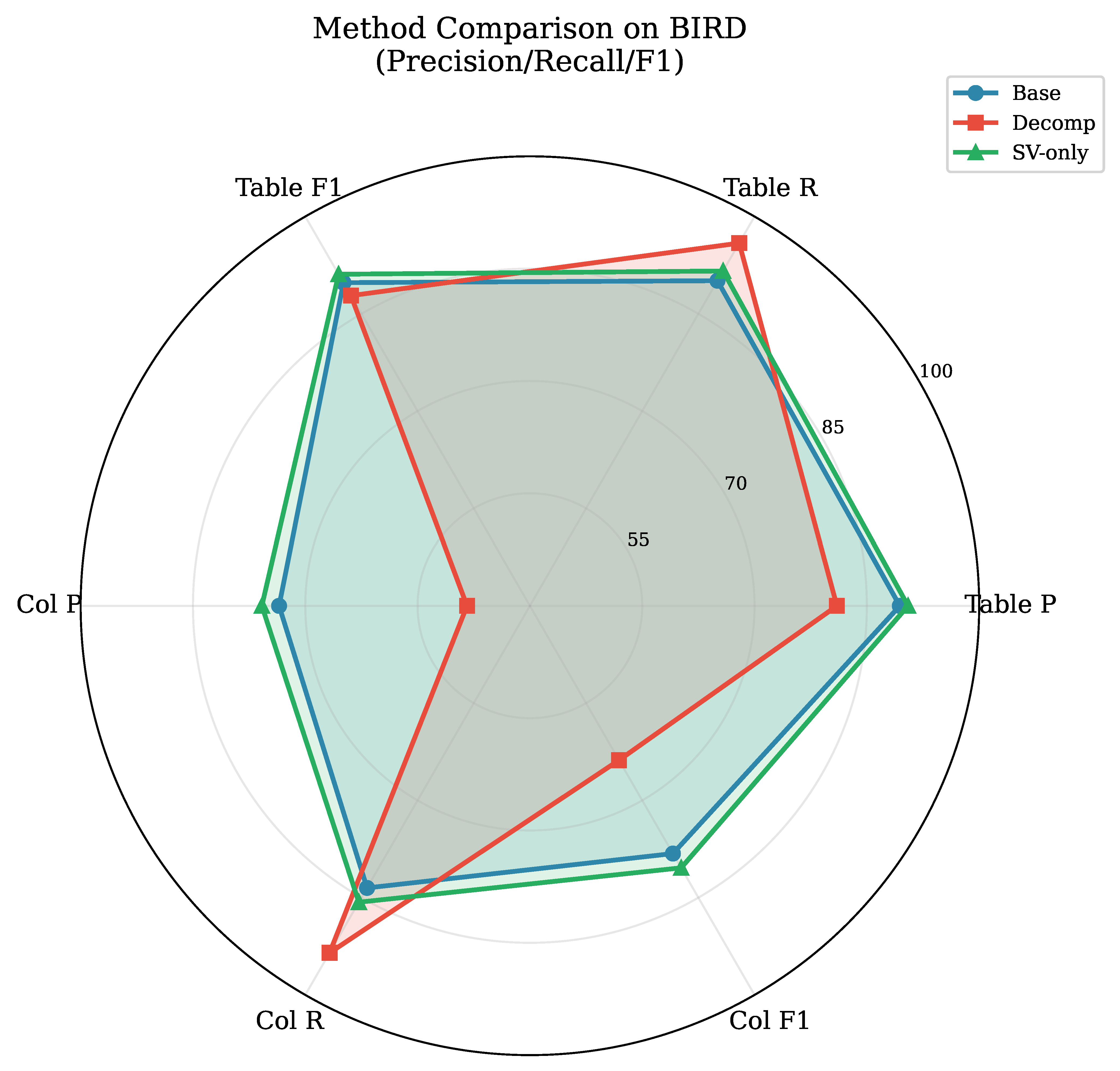 Figure 5. Radar chart comparing base, Decomp, and SV-only methods on BIRD across six metrics. SV-only (green) achieves the best overall balance, while Decomp (red) sacrifices precision for recall. The chart clearly shows how decomposition dramatically reduces column precision while only marginally improving recall.