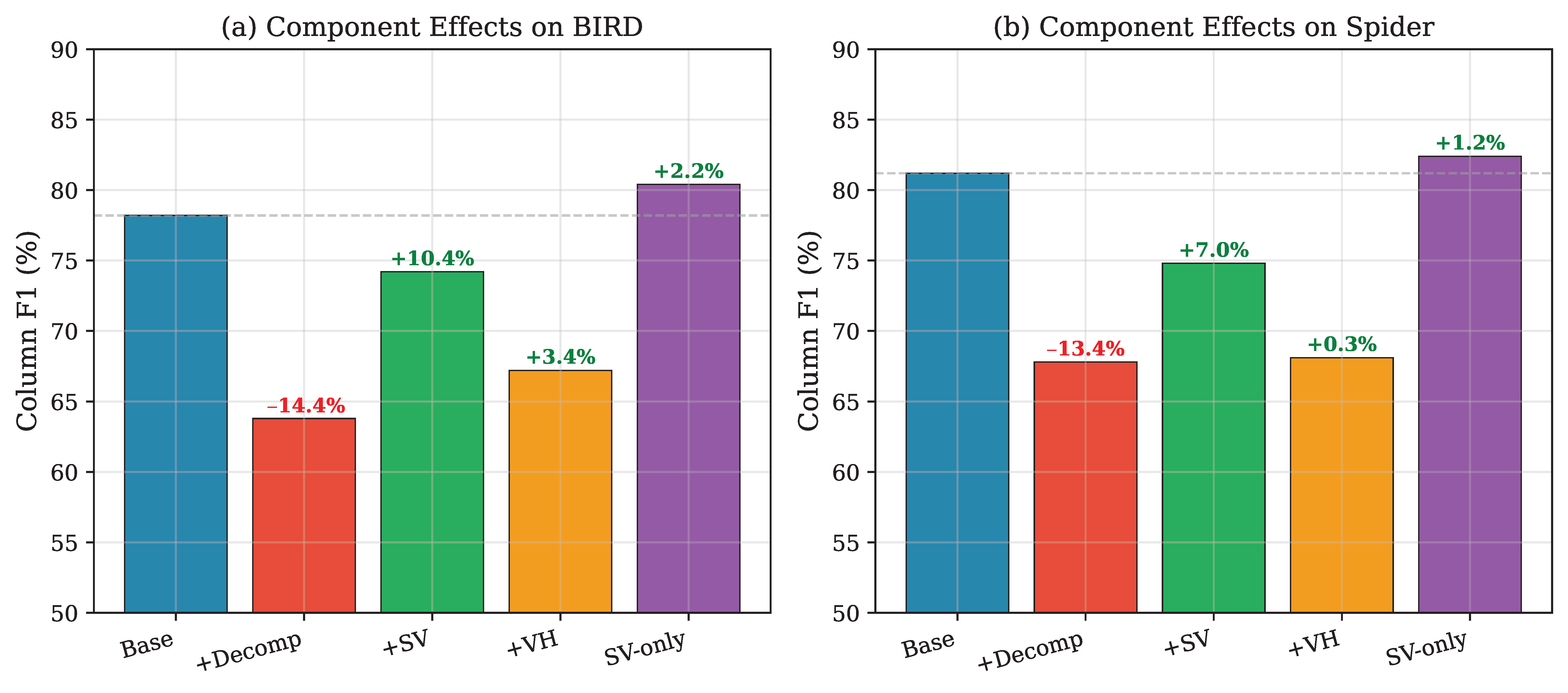 Figure 6. Component contribution analysis showing Column F1 changes on both datasets. Decomposition causes a significant drop in Column F1 (−14.4% on BIRD, −13.4% on Spider), which is partially recovered by adding SV. The SV-only method achieves the best Column F1 by avoiding decomposition entirely.
