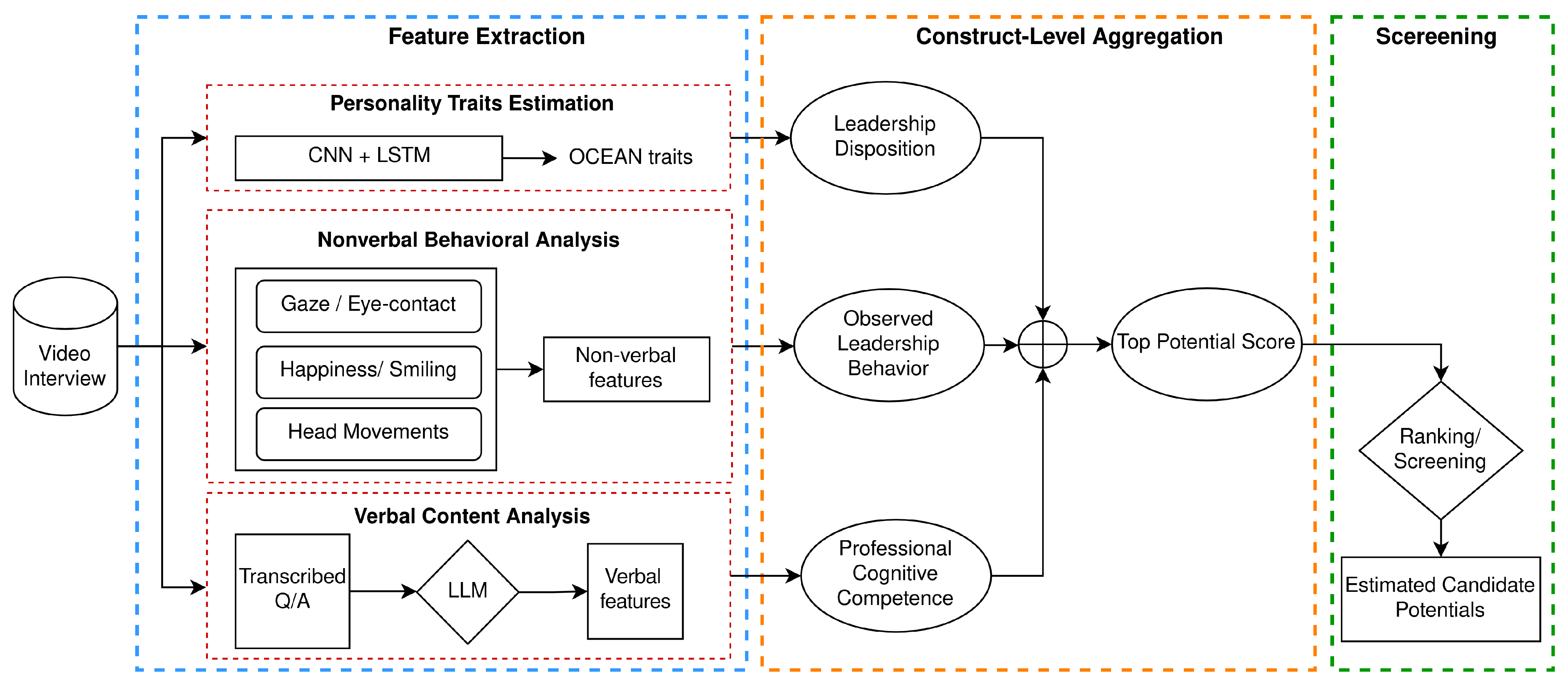 Each modality produces standardized feature vectors that aggregate into three interpretable constructs: Professional–Cognitive Competence (verbal reasoning and strategic thinking), Observed Leadership Behavior (nonverbal expressivity and engagement), and Leadership Disposition (personality-based readiness). These constructs combine into a single Top Potential Score for candidate screening. The method is construct-driven: every computational signal maps directly to established concepts in industrial–organizational criteria, ensuring both interpretability and theoretical grounding.
