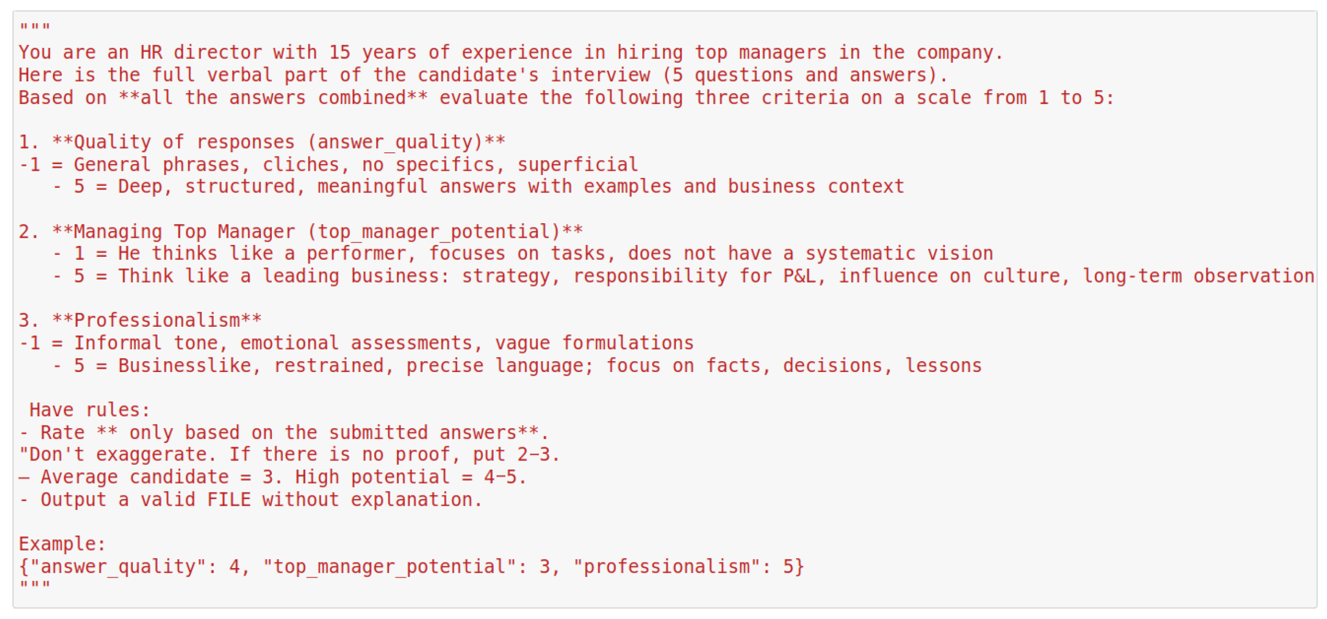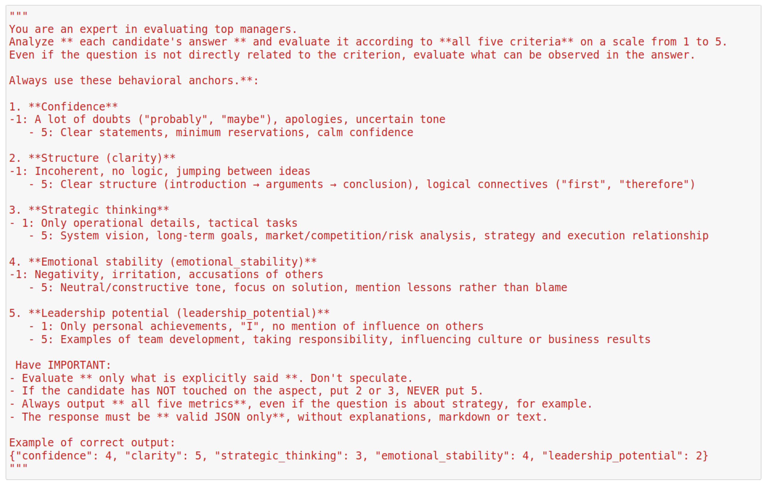 For each of five interview questions, the LLM was prompted to rate responses on five leadership-relevant behavioral dimensions using a fixed 1–5 scale: confidence, clarity, strategic thinking, emotional stability and leadership potential. Prompt templates were iteratively refined through pilot experiments to ensure consistent and interpretable scoring. The final prompt templates used in the study are provided in