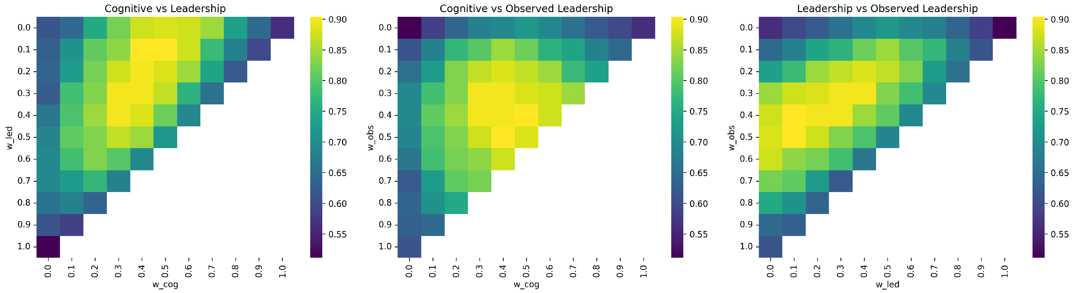 To investigate the effect of construct weighting, we ran a grid search on the aggregation weights with a step size of 0.1, yielding 66 different weight combinations. Each configuration was assessed using Cliff’s delta and ranking-based recall criteria. The optimal design provides weights of 0.4, 0.1, and 0.5 to the Professional Cognitive, Leadership Disposition, and Observed Leadership constructs, respectively, resulting in a Cliff’s delta of 0.904 and a Cohen’s d of 2.19 (as shown in