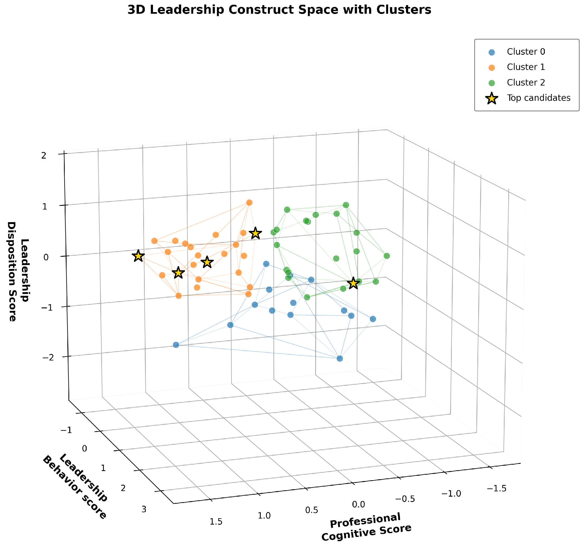 Figure 7). Clustering was not utilized for classification, but rather to investigate structural trends in the data. One cluster had significantly higher construct means and featured a majority of top candidates, whereas the other clusters matched to lower leadership characteristics. However, due to the small sample size, the clustering results are interpreted as exploratory and illustrative rather than predictive.