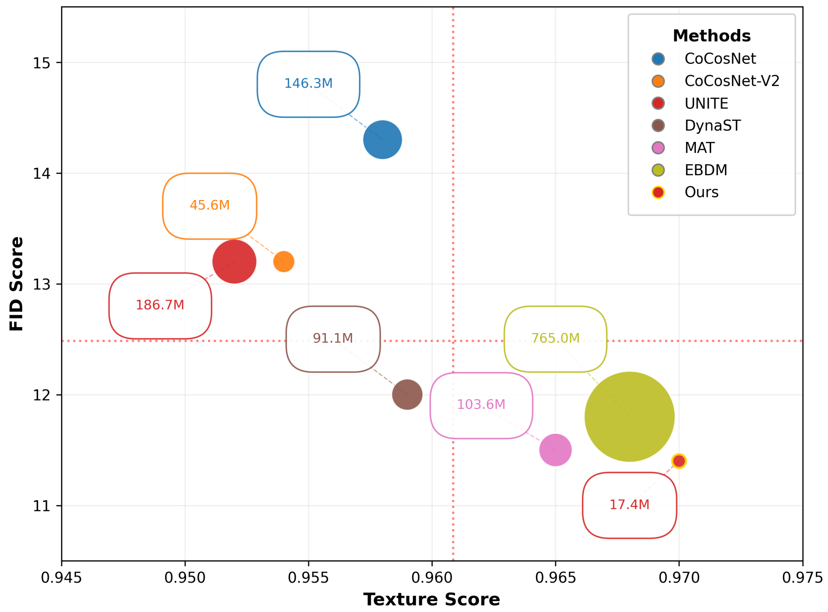 | Model | FID ↓ | SWD ↓ | Texture ↑ | Color ↑ | Semantic ↑ |