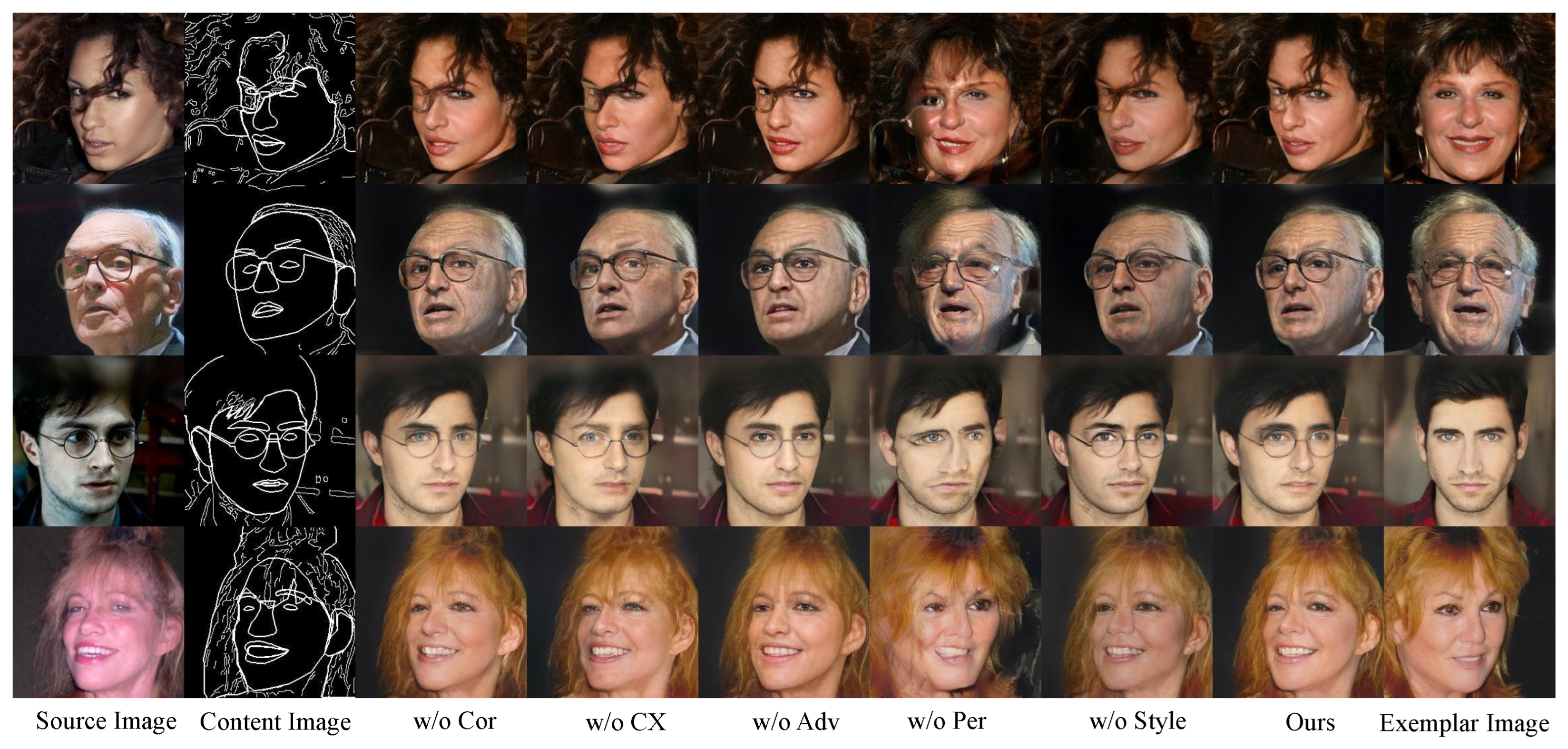 - Zhang, P.; Zhang, B.; Chen, D.; Yuan, L.; Wen, F. Cross-domain correspondence learning for exemplar-based image translation. In Proceedings of the IEEE/CVF Conference on Computer Vision and Pattern Recognition; Computer Vision Foundation: New York, NY, USA, 2020; pp. 5143–5153. [Google Scholar]