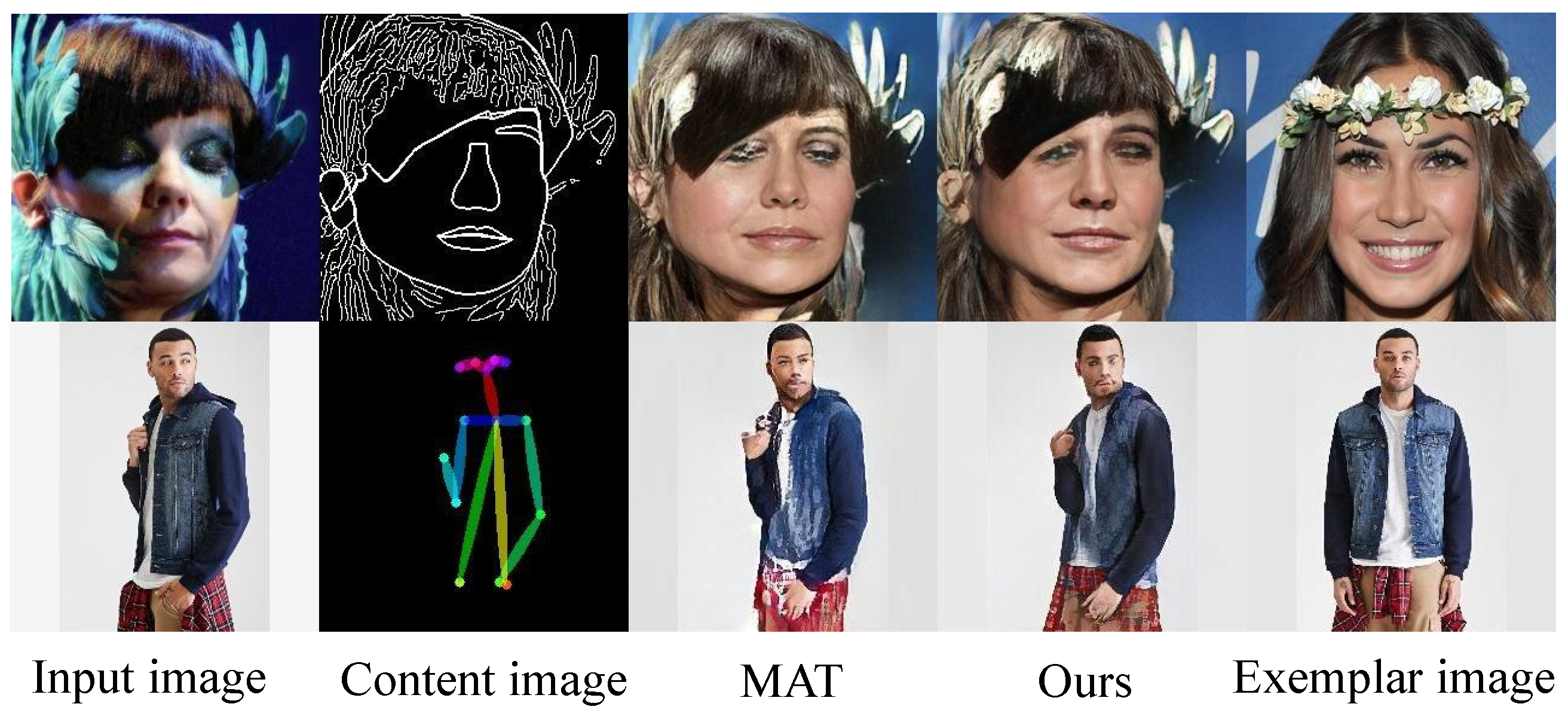 - Jiang, C.; Gao, F.; Ma, B.; Lin, Y.; Wang, N.; Xu, G. Masked and Adaptive Transformer for Exemplar Based Image Translation. In Proceedings of the IEEE/CVF Conference on Computer Vision and Pattern Recognition; Computer Vision Foundation: New York, NY, USA, 2023; pp. 22418–22427. [Google Scholar]