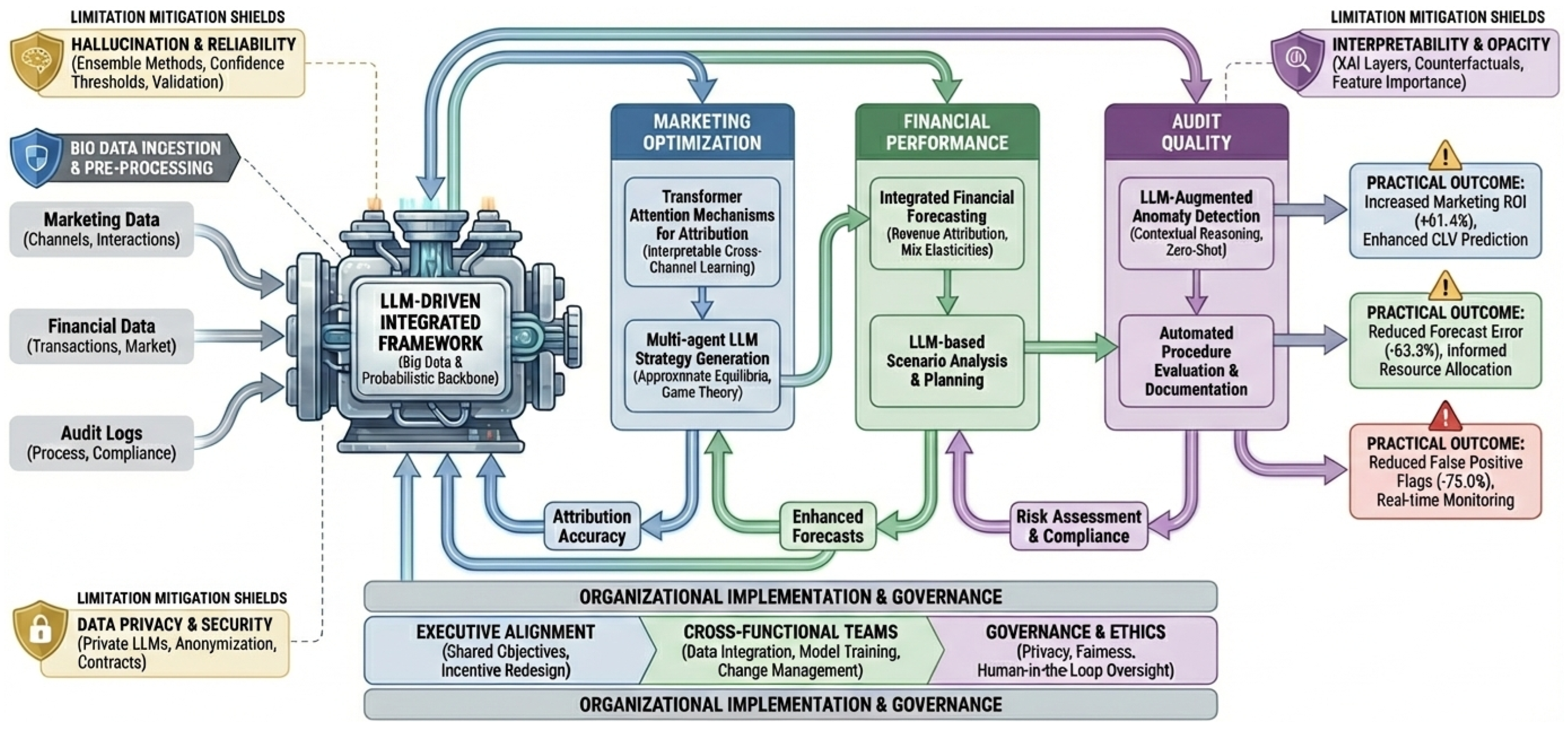 The theoretical contributions, such as formalization of the LLM-enhanced game theory, attribution based on attention with financial ties, and synthesized probabilistic models broaden the premise of market science, financial analytics, and audit research methodology. Practical tools to be implemented are the algorithmic contributions: prompt engineering to optimize a model, domain-specific prediction, and explainability augmented with an LLM. The empirical findings that 61.4% of marketing ROI, 63.3% of financial forecasting errors, and 75.0% of audit false positives are reduced prove that the suggested methods do provide quantifiable value. Nevertheless, it takes more than technological prowess to implement it successfully, and it involves organizational congruency, policy structures, and careful management of the remaining risks. The implementation stage demands change management that facilitates the cross-functional cooperation, incentive restructuring that is based on the integrated value optimization, and continuous monitoring of the algorithm performance. Companies should carefully strike the automation incentives and residual risk by using governance systems that focus on transparency, accountability, and human controls.