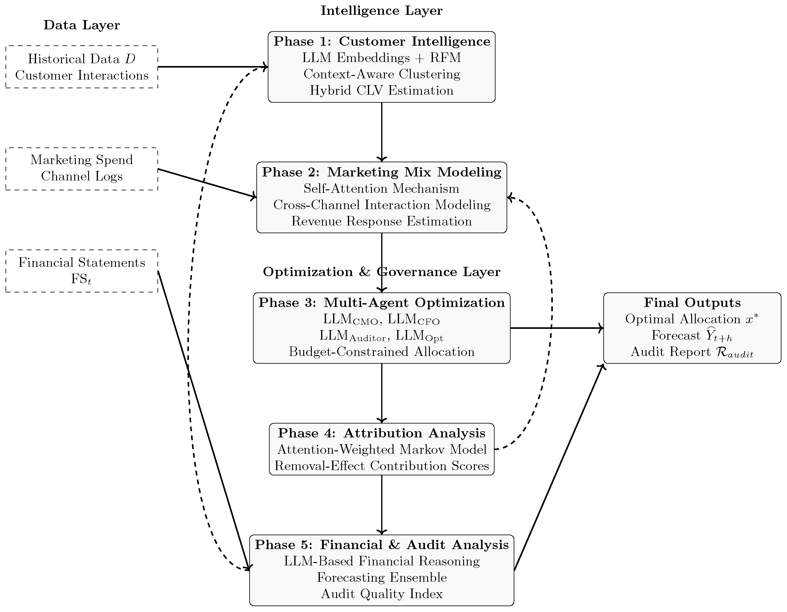 6]; (2) to develop concrete algorithms for attention-informed attribution, multi-agent LLM optimization, and LLM-augmented financial and audit analytics; and (3) to empirically evaluate the framework on large-scale e-commerce data, assessing its impact on marketing ROI, forecasting accuracy, fraud detection, and audit quality [