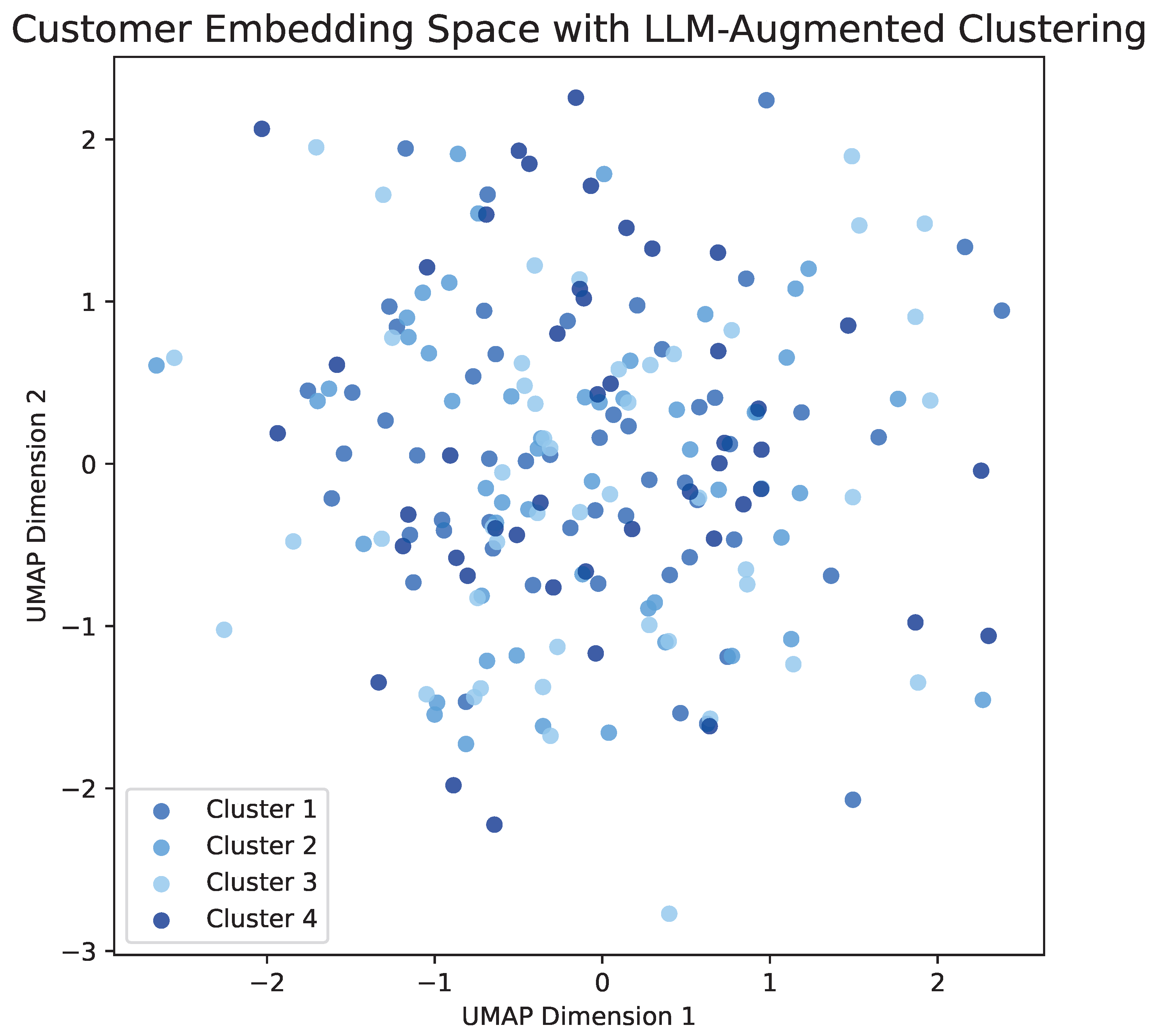 Figure 3 shows that the LLM-enhanced clustering yields well-separated customer groups, as evident in the 2-D embedding space. This demonstrates that our method captures meaningful segment structure beyond traditional approaches.