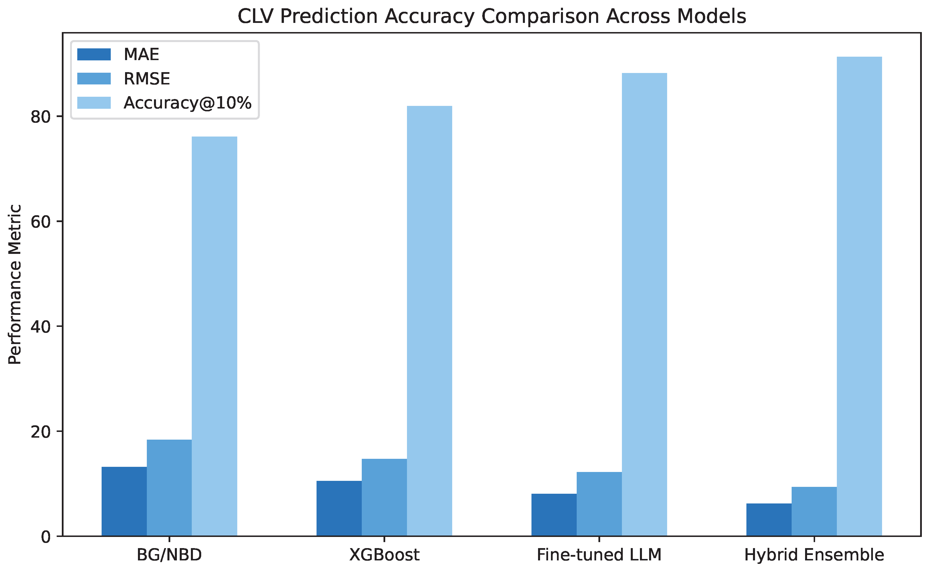 Figure 4 shows that the LLM Hybrid Ensemble achieves the highest CLV prediction accuracy and lowest error rates compared to baselines.