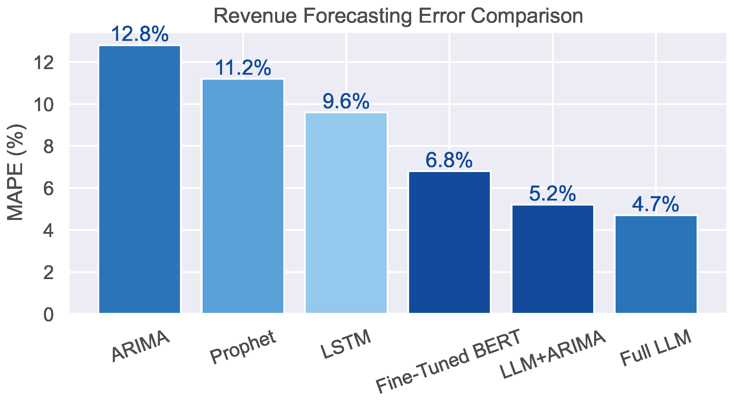 The output of the financial forecasting process determines a number of significant patterns. First, LLM-enhanced techniques are very significant: the multi-method ensemble decreases MAPE by 63.3 percent, intended to reflect an average of 3.1M in error on a revenue-based of 2.14B as compared to ARIMA (4.7% vs. 12.8%). Second, this benefit is especially significant in longer-term predictions: twelve-month ahead accuracy is 93.8% of LLM ensembles compared to 78.4% of ARIMA, an improvement of 19.9 percentage points. This implies the high capability of the LLams to represent regime shifts, competition reactions, and market development that cannot be represented by the historical trends. Third, the bias of the LLM-based systems is much lower (0.04 percent) than in the traditional methods, where systematic over- or under-forecasting is reduced to a minimum. Fourth, group methods that incorporate both the LLM and statistical rigor yield better results than either, using the advantages of domain reasoning and statistics, respectively. As shown in