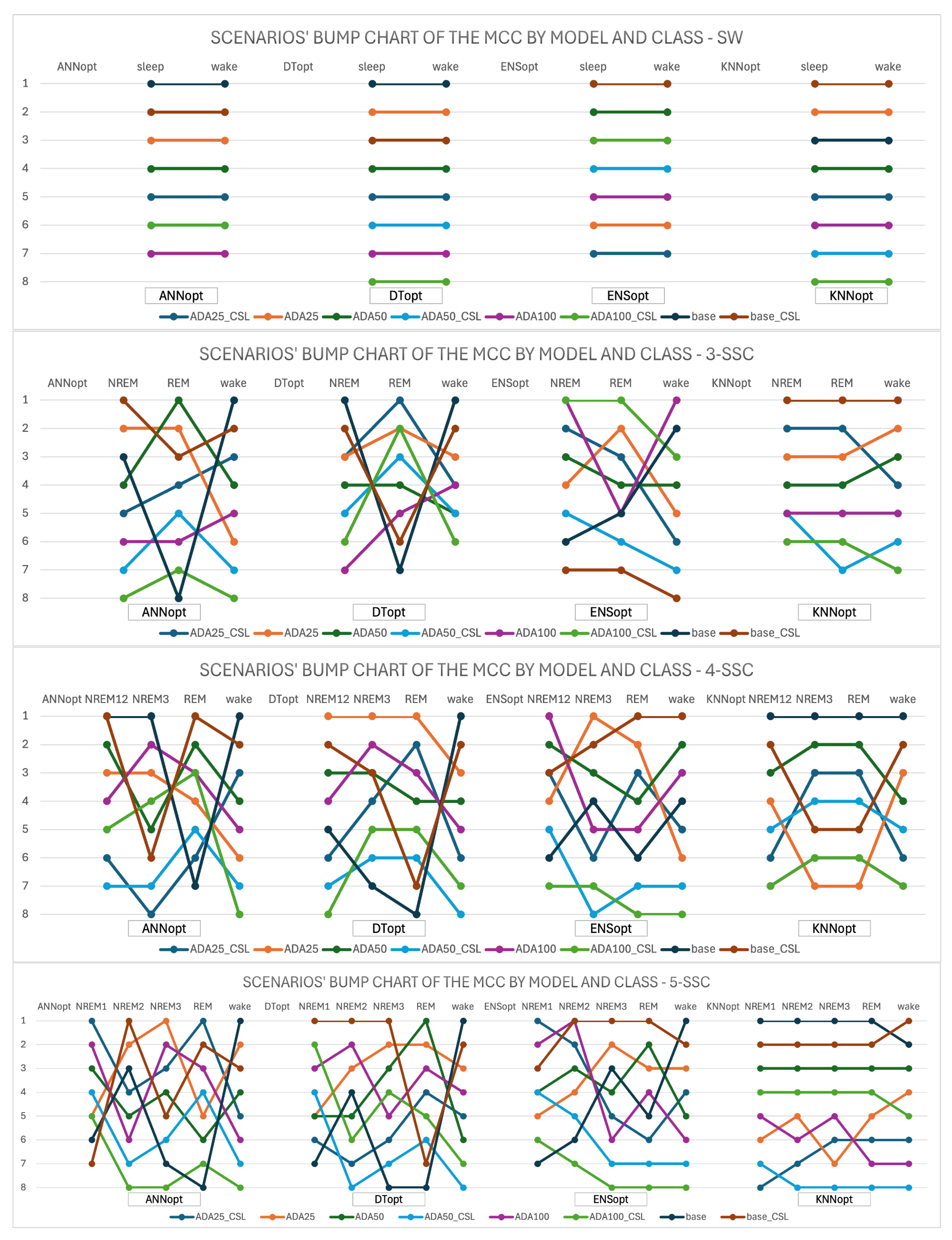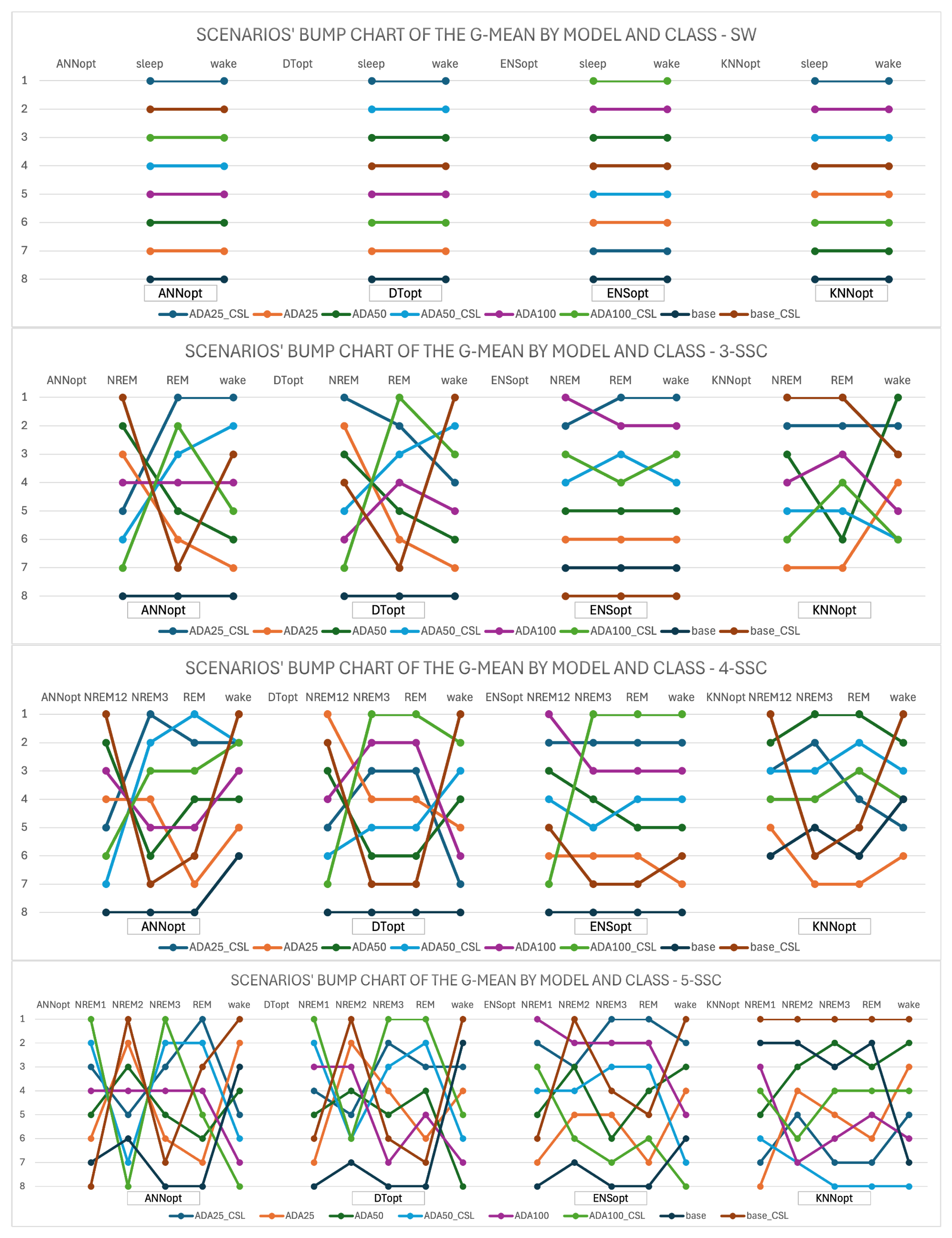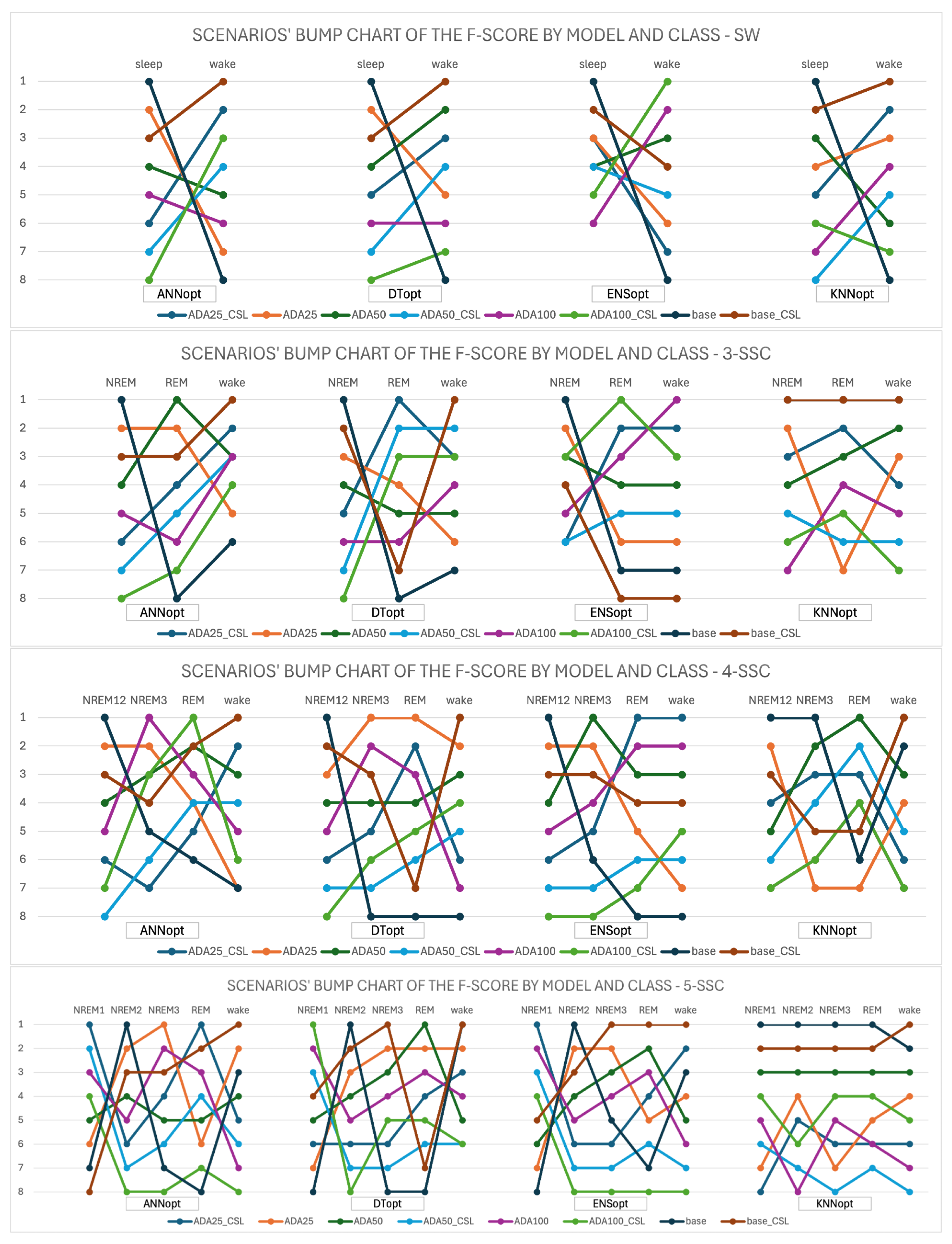 In this work, several experiments under diverse modeling scenarios, addressing different SSC tasks, were performed. Specifically, we performed experiments embracing three main variability dimensions: different models, different data-level techniques (scenarios), and different SSC tasks. The presentation of all the results could be overwhelming for the reader. For this reason, visually powerful bar charts and bump charts are presented hereafter. Extensive tables containing all the detailed numerical results can be found in the