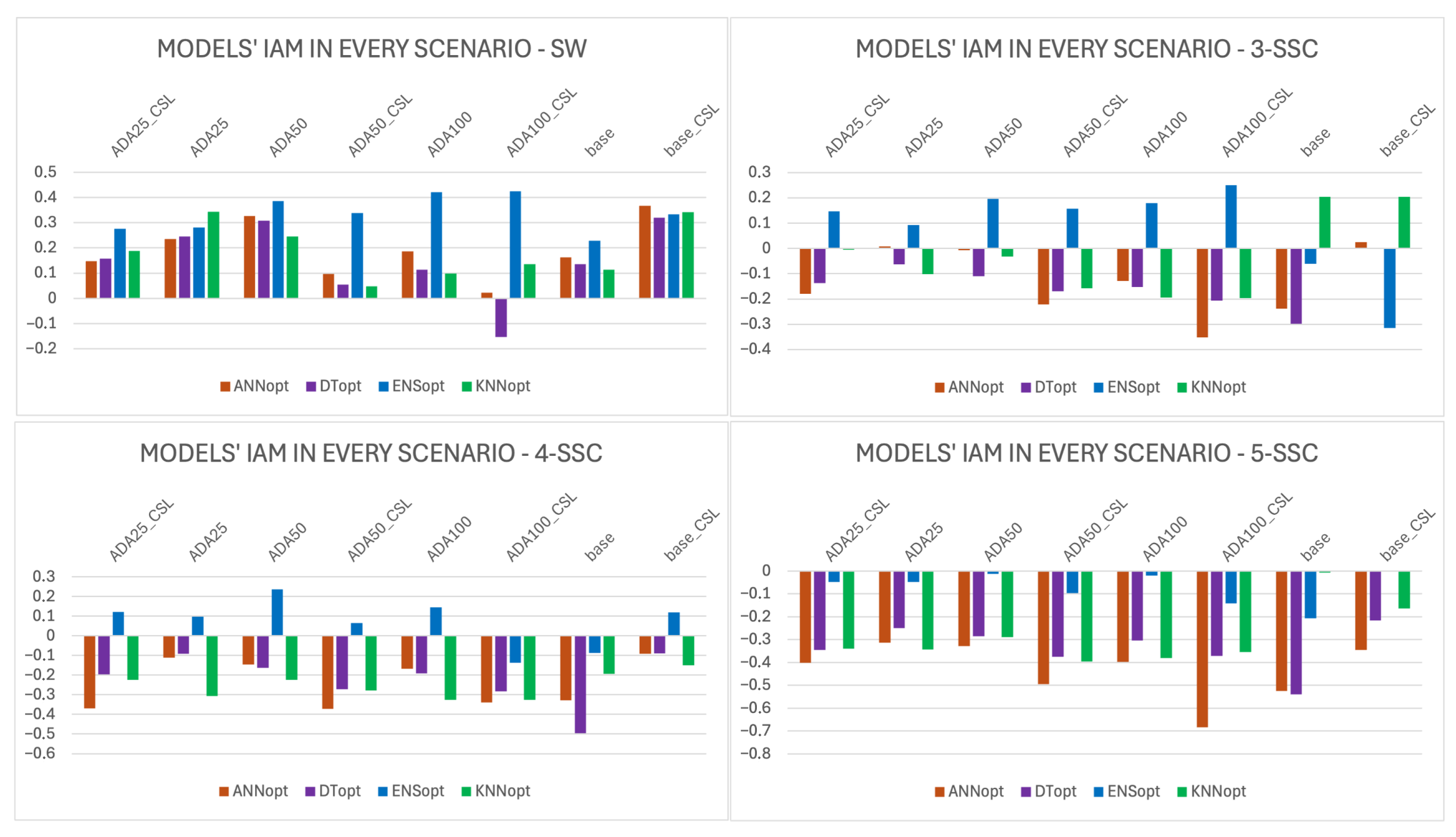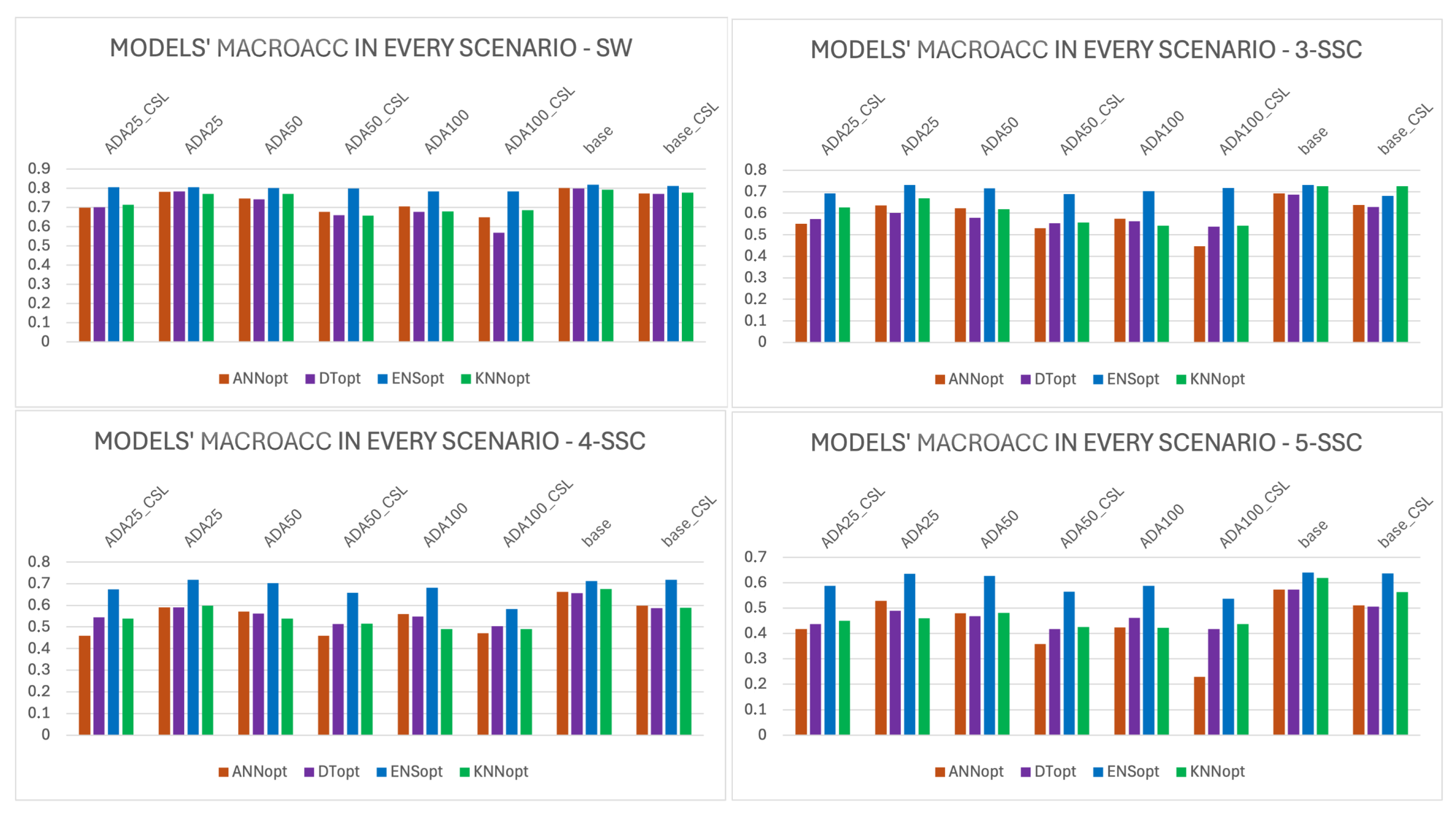 Different models appear to be differently affected by the imbalance management technique (oversampling and/or CSL); in simpler tasks (binary or ternary), ANN and DT are similar to each other, whereas in more complex tasks (4-SSC and 5-SSC) every model benefits from different modeling scenarios in a completely different way.
