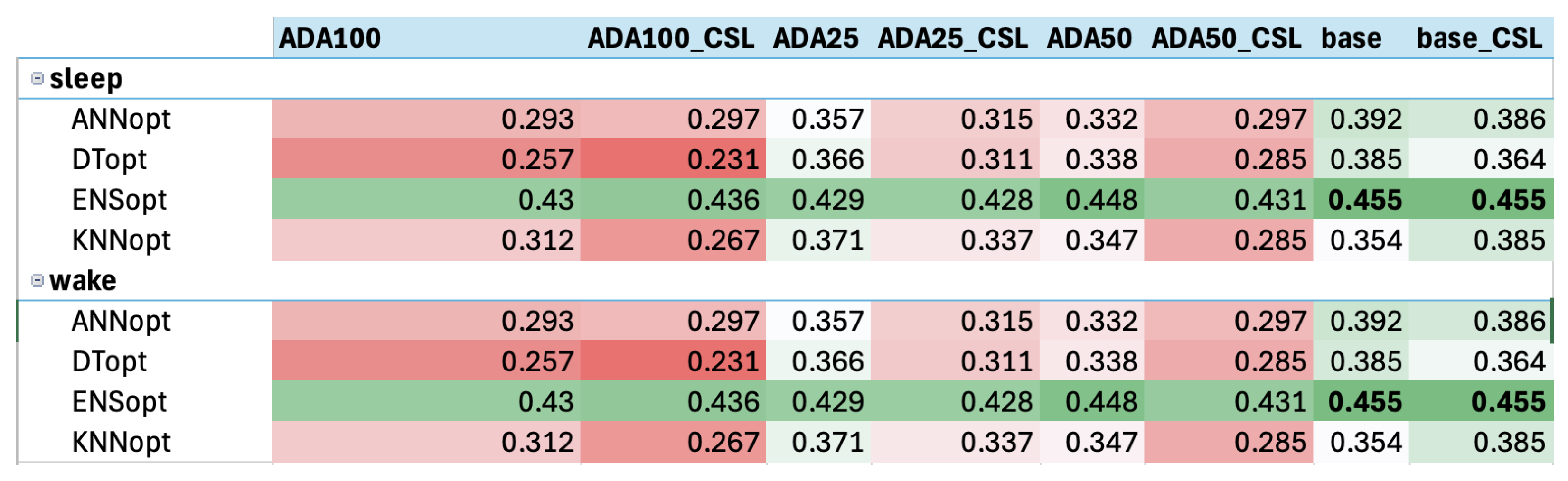 Gentle Adaptive Boosting is the optimal ensemble method for the SW task—ADA100, ADA50, ADA25, ADA100_CSL, ADA50_CSL, and ADA25_CSL;