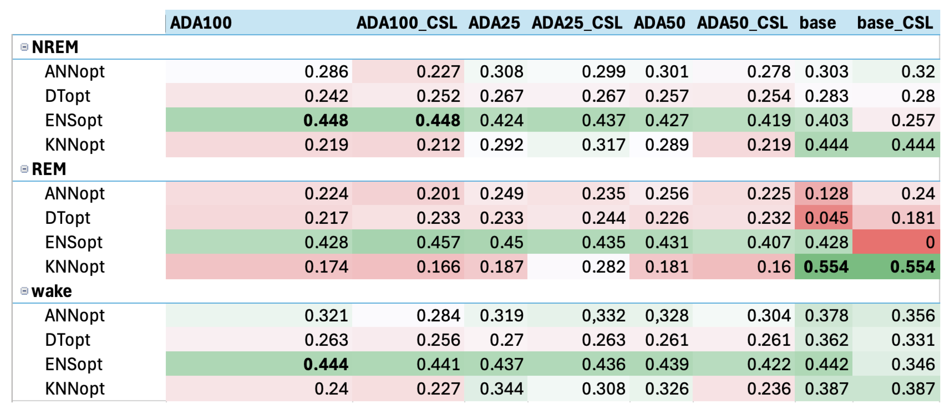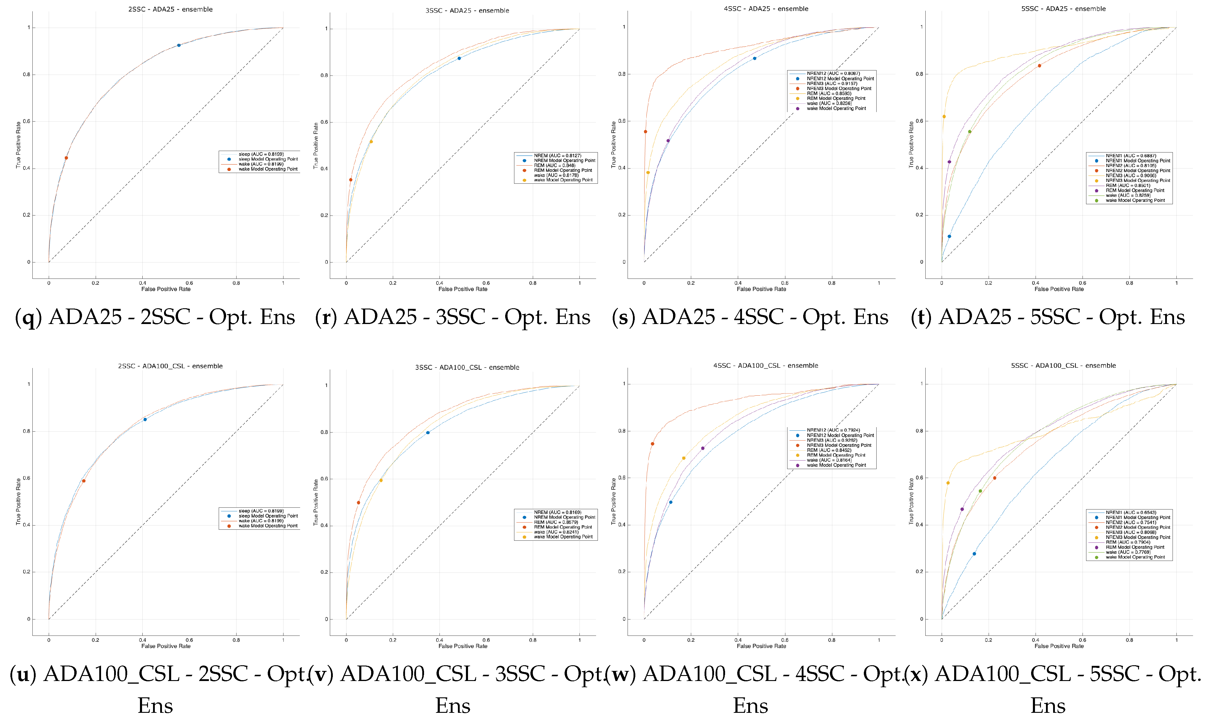 The ADA100 is the best (coupled with the ensemble only) in the NREM and wake classes for the 3-SSC task, in the NREM12 (majority) class for the 4-SSC task, and for the NREM2 (majority) class for the 5-SSC task;