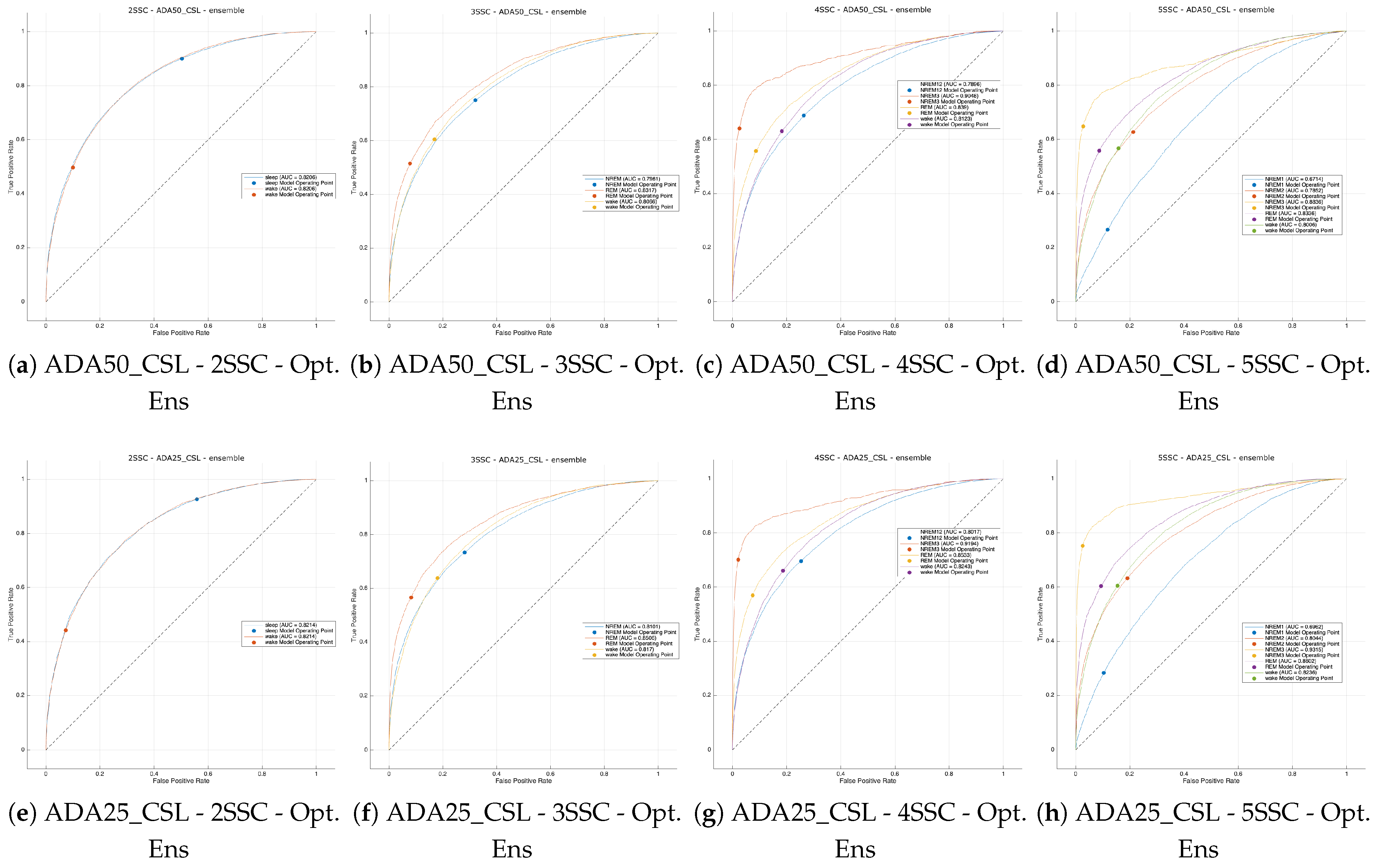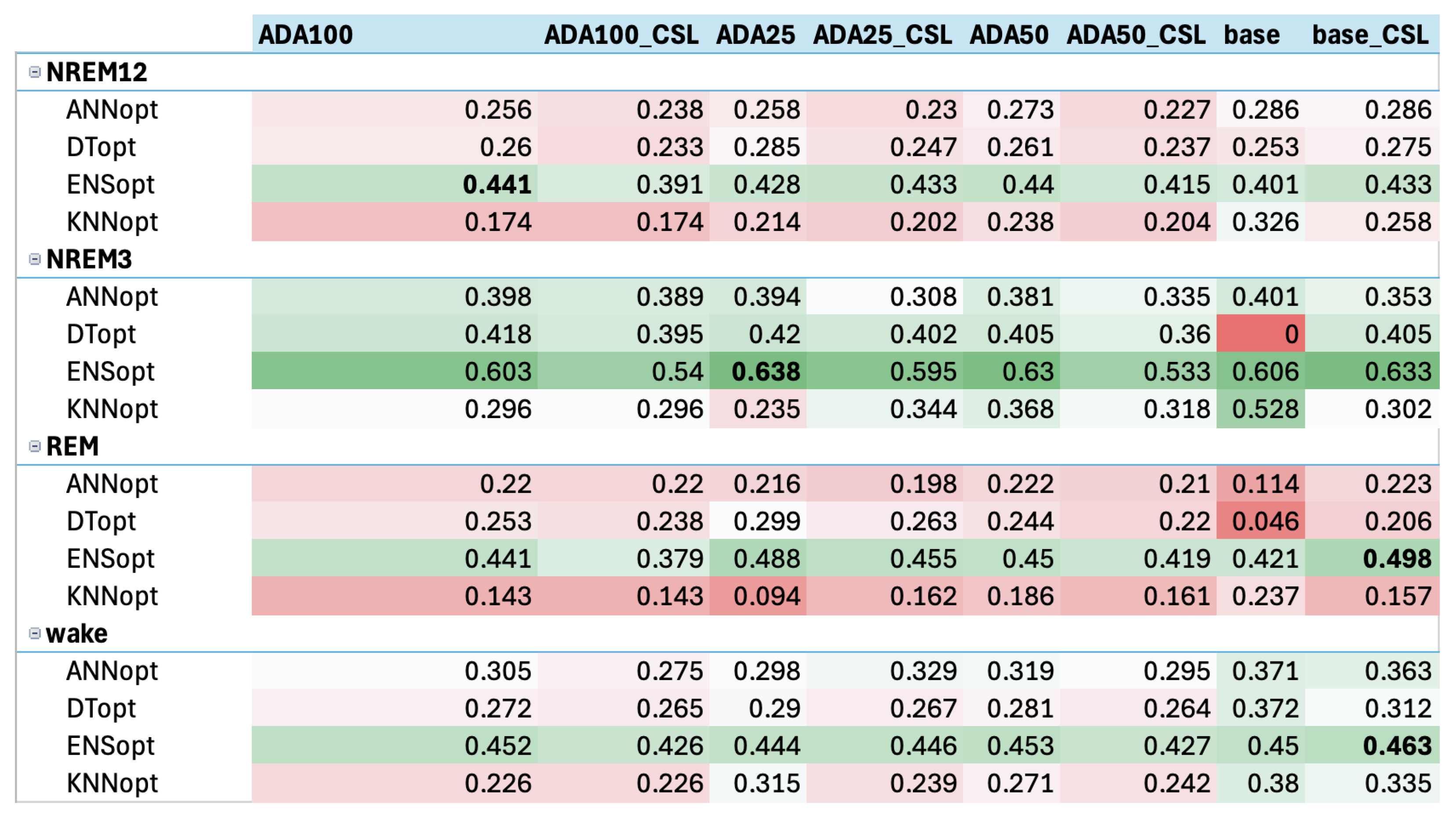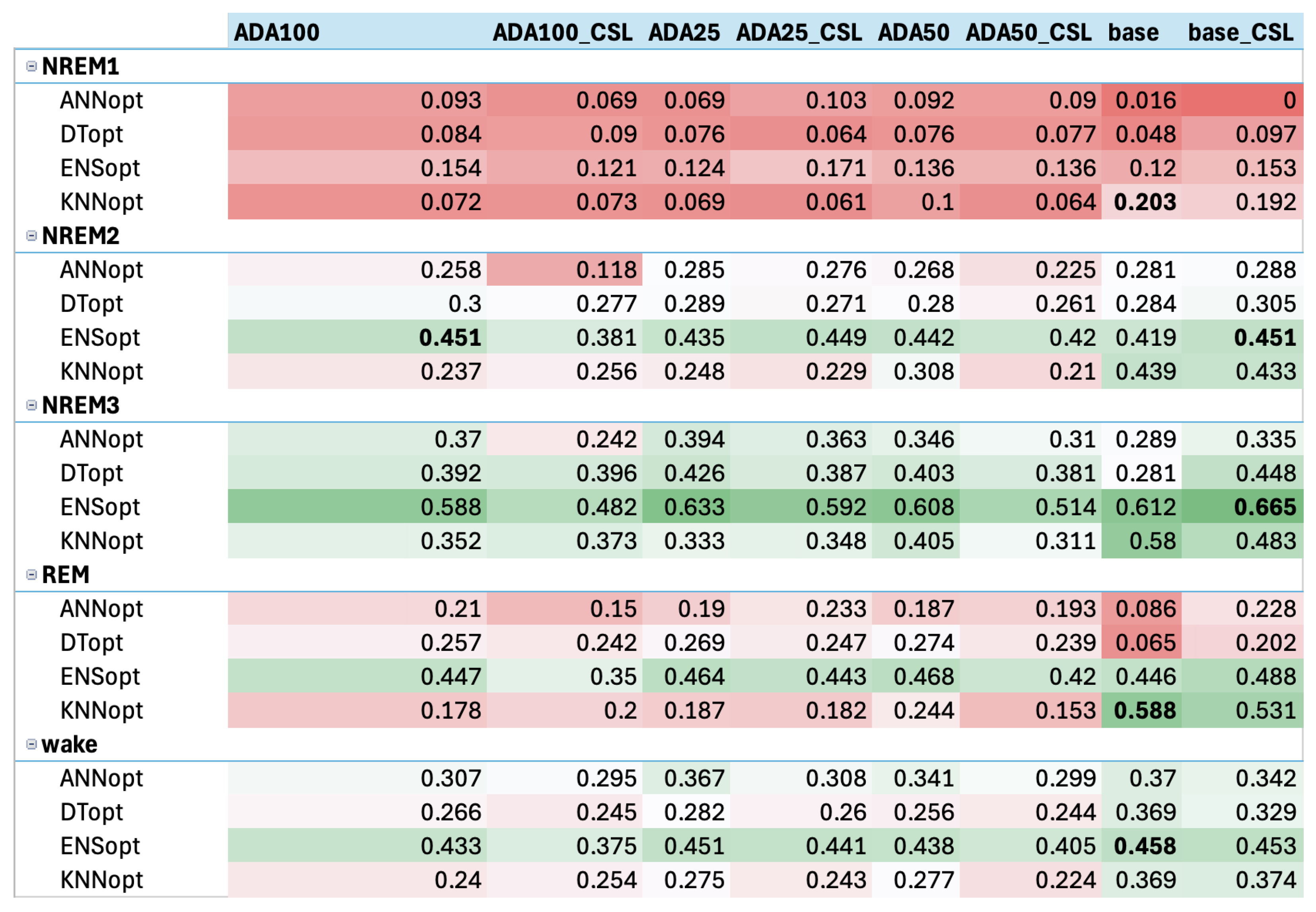 The ADA25 is the best (coupled with the ensemble) in the NREM3 (minority) class for the 4-SSC task.