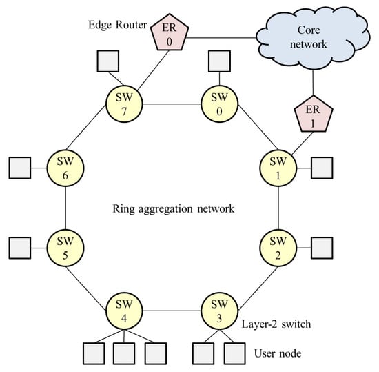 Figure 1, is an efficient and widely-used topology for forwarding traffic from widely-distributed user nodes to a core network. A Layer-2 ring with Ethernet Ring Protection (ERP) [