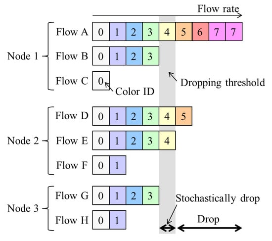 Figure 2. After the color marking, they are sent to the dropper. At the dropper, frames are selectively discarded on the basis of a dropping threshold and the frame color. Undropped frames are enqueued in a BE queue. The dropping threshold is shared with the SWs. Consequently, per-flow throughput fairness is achieved. Details for the marking, frame drop and threshold notification are described in the following subsections.