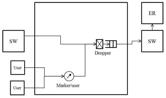 . Each queue uses a dropper. The frames coming from users are marked with colors by the per user marker. The frames arriving from the ER are assumed to be marked with colors in the same way. The marked frames are divided and transmitted to the queues based on their destination.