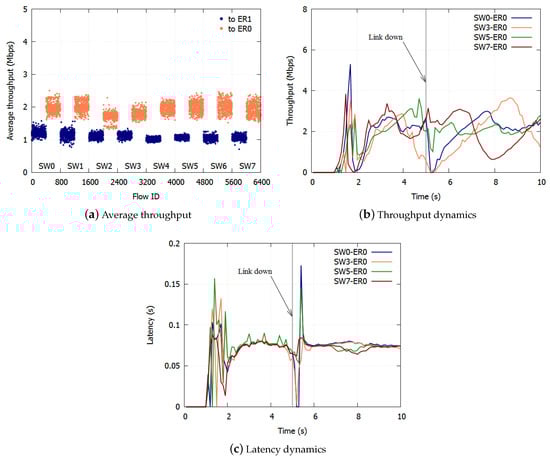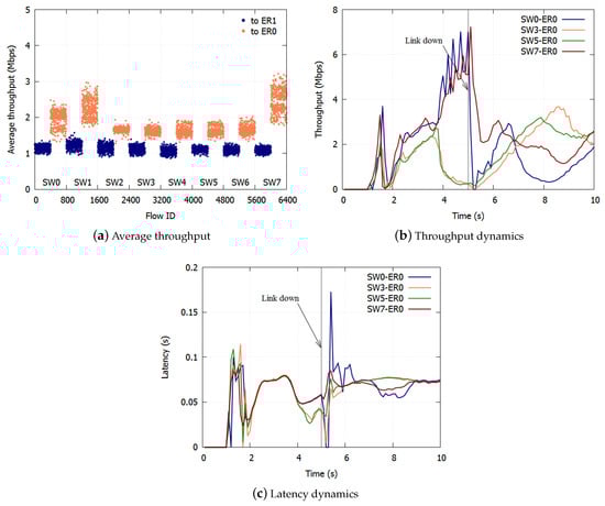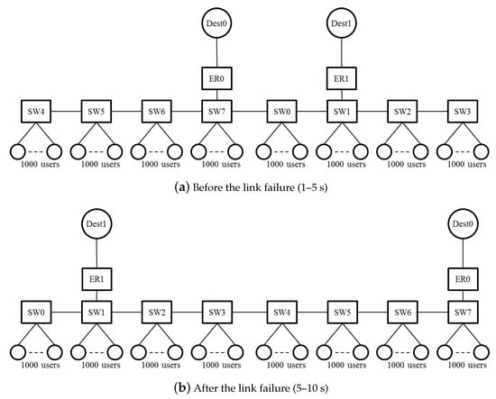 Figure 4 shows an SW that is connected to an ER and whose links to adjacent SWs are not blocked. At an SW that is not connected to an ER, the queue to the ER is not used. When either of the links to adjacent SWs is blocked, the link does not transmit any data frame. Only BE queues are shown in